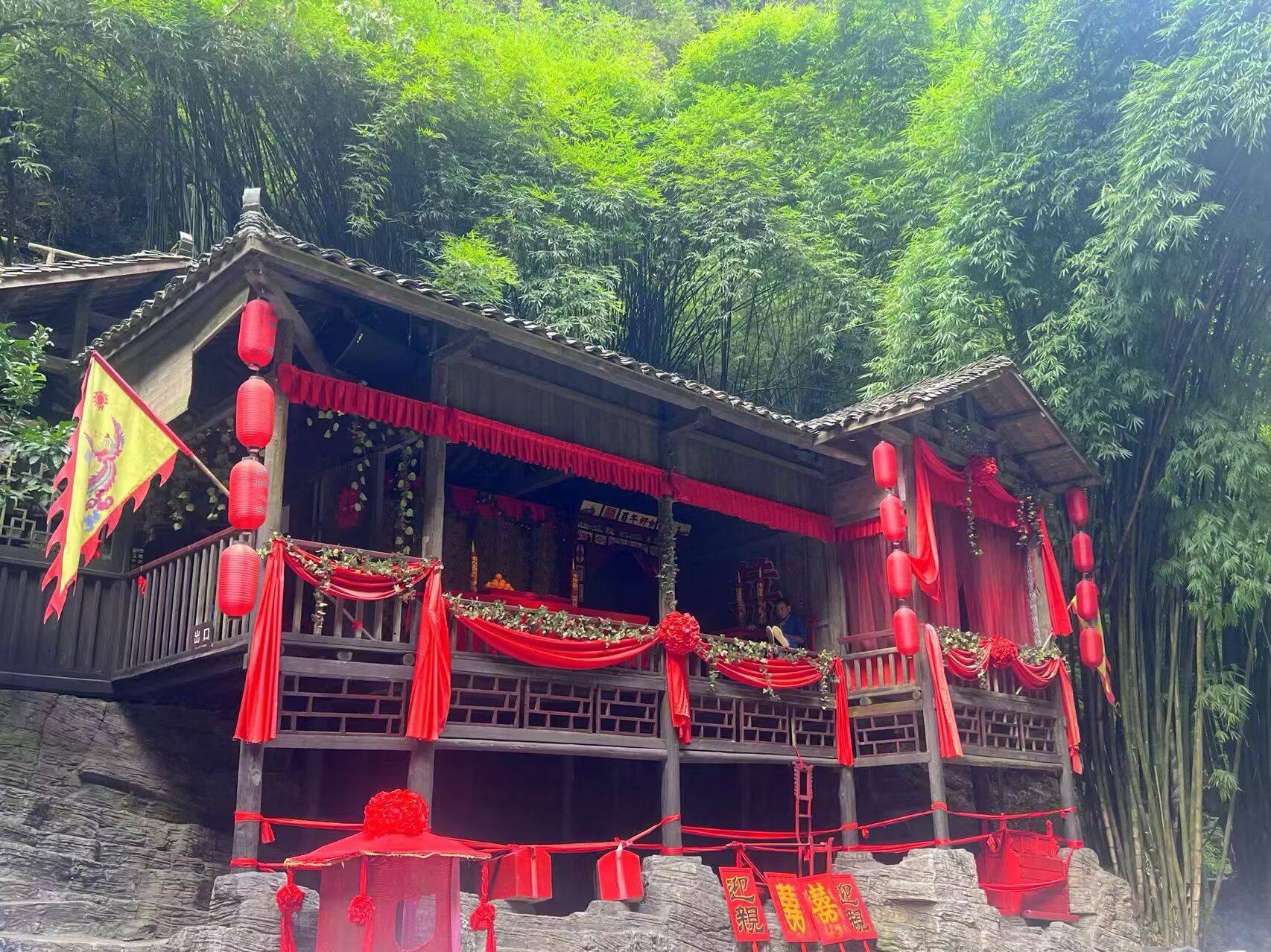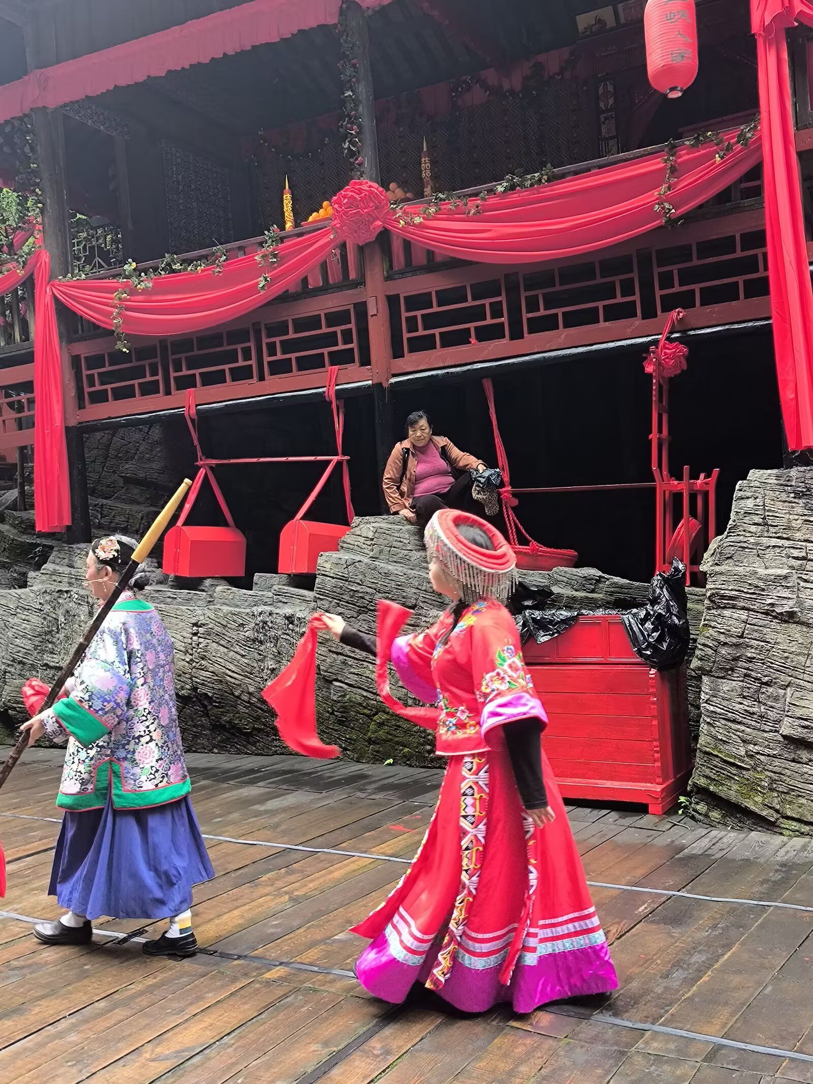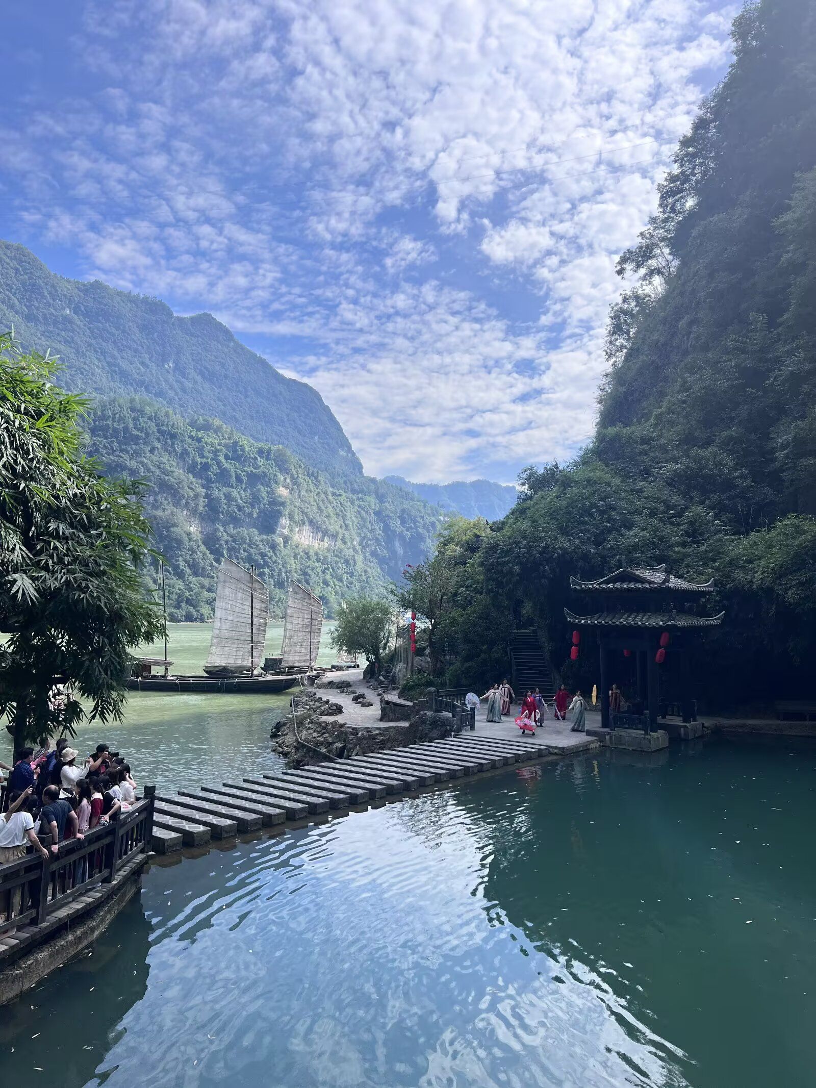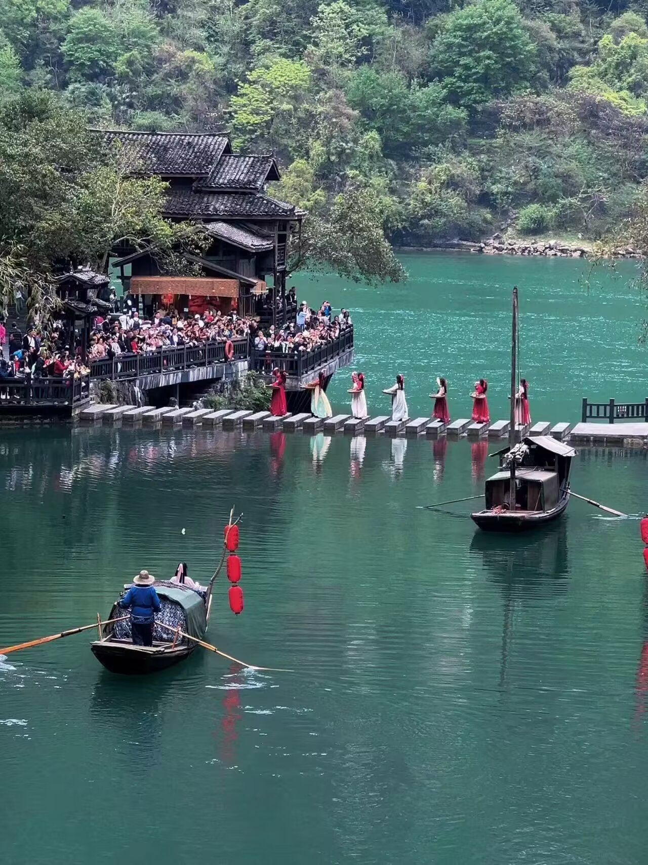 我还去了三峡人家,三峡人家,依山傍水,风情如画,传统的三峡吊脚楼点缀于山水之间。三峡人家人文景点包括水上人家、溪边人家、山上人家,看了几场表演,看了山顶的巴王宫,看了茶盐古道,其实用不着特意看什么,只是在云雾缭绕的绿意浓烈的三峡人家景区里随便走走,远离了城市的喧嚣,没有了日常琐事的烦恼,就已经足够开心了。