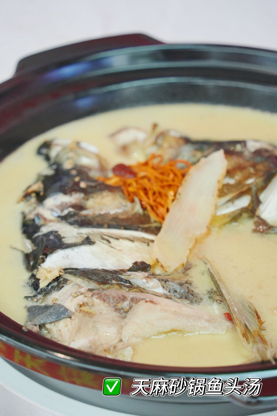 天麻砂锅鱼头:大头鱼搭配天麻、虫草花等食材,香气扑鼻,鱼肉鲜嫩,汤汁带着草木清香,营养又美味!