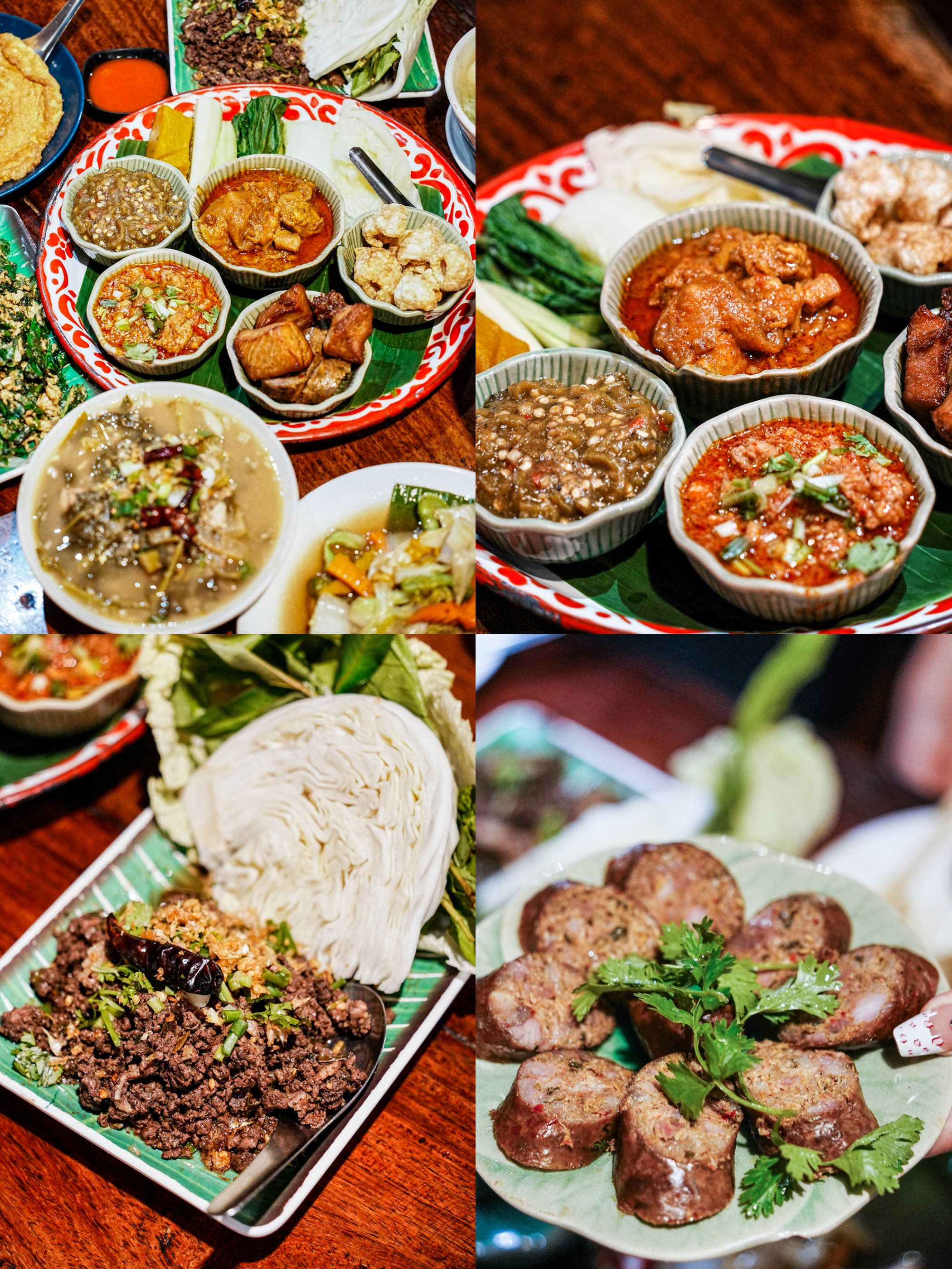 这里供应的都是正宗的泰北美食,价格也很实惠。推荐每桌必点的小食拼盘,里面搭配了咖喱猪肉,泰北香肠,炸猪皮,再配上番茄酱,剁椒酱和肉末酱,口感层次超丰富。脆皮五花肉也不容错过,肥而不腻,搭配着辣椒酱,一口下去超满足。