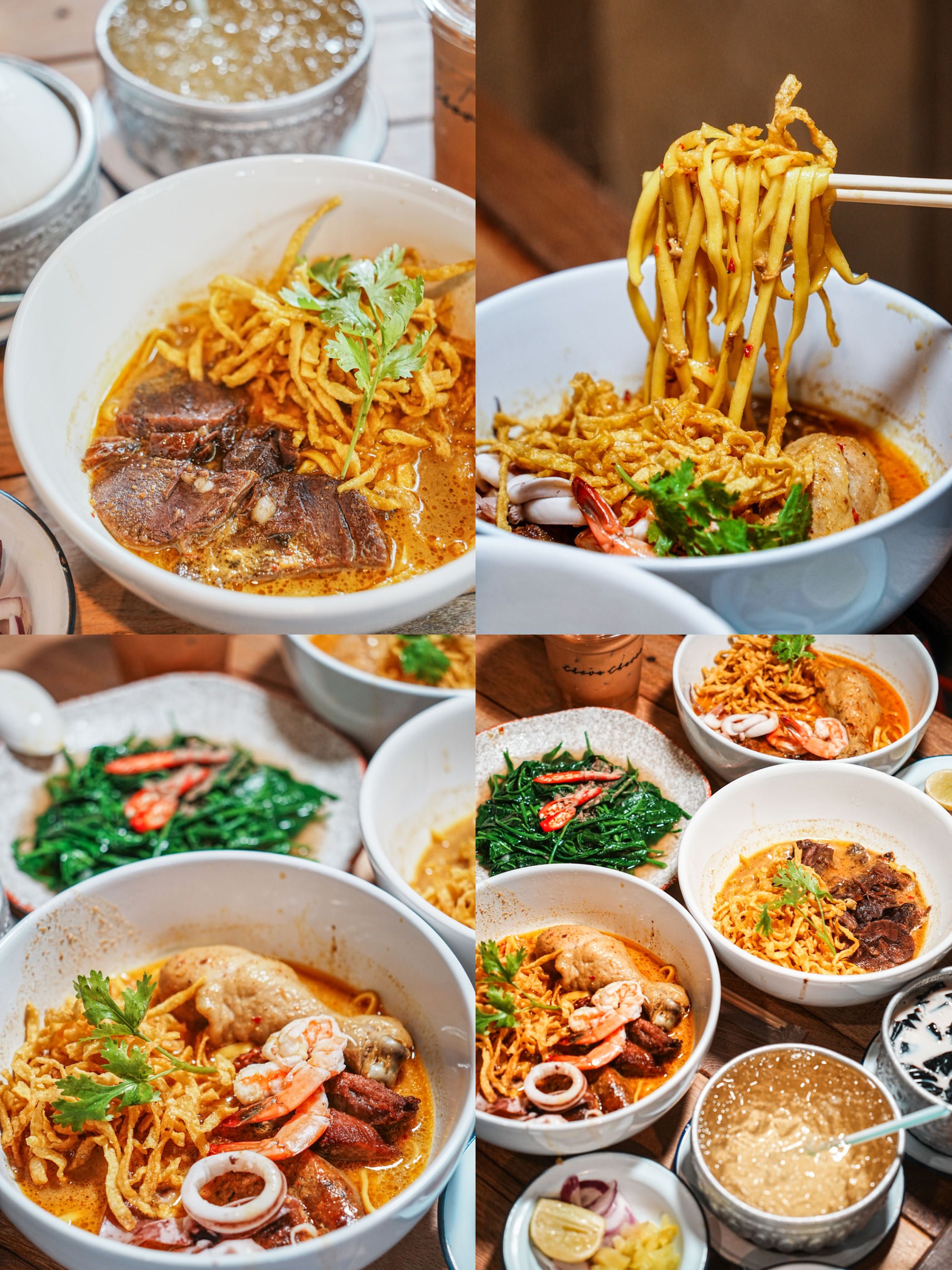 他家的泰北特色咖喱面必尝,咖喱汤底浓郁醇厚,还带有一丝微辣的口感,里面有一般的黄面和酥脆的炸过的面条 ,把两种混在一起吃,酥软两种口感交织,层次超丰富。面条配菜也超给力,比如鸡腿大得让人惊喜。对了,他家的甜点很有特色,推荐全家福和椰子