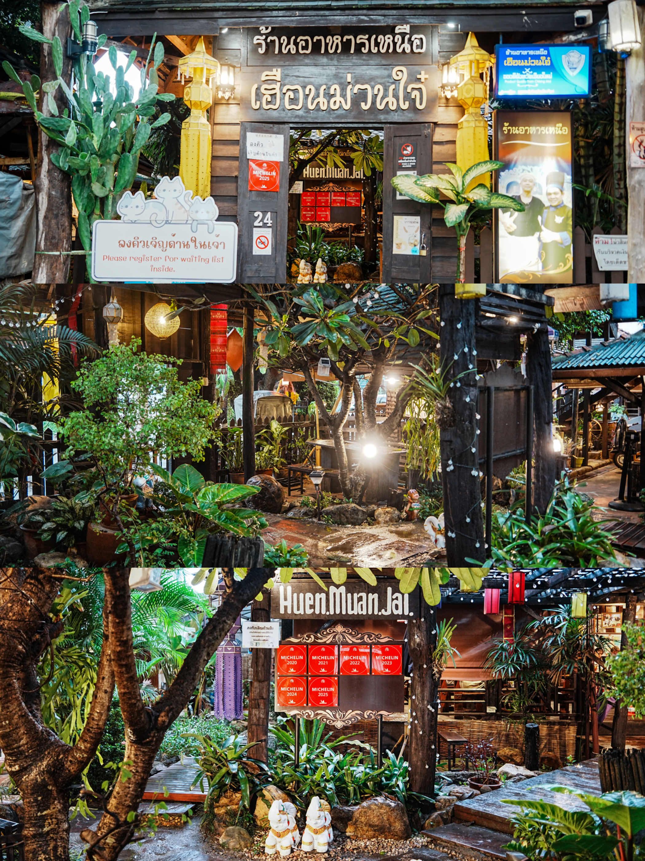 这家餐厅可是米其林推荐的宝藏店铺,已经被收录长达 11 年。它的名字意为 “幸福之家” ,由曾登上电视节目的主厨 Charan Thiphoong 创立。餐厅坐落在一栋传统的兰纳风格房屋内,周围环绕着绿意盎然的花园,仿佛一下子把人带入了充满诗意的泰北生活。