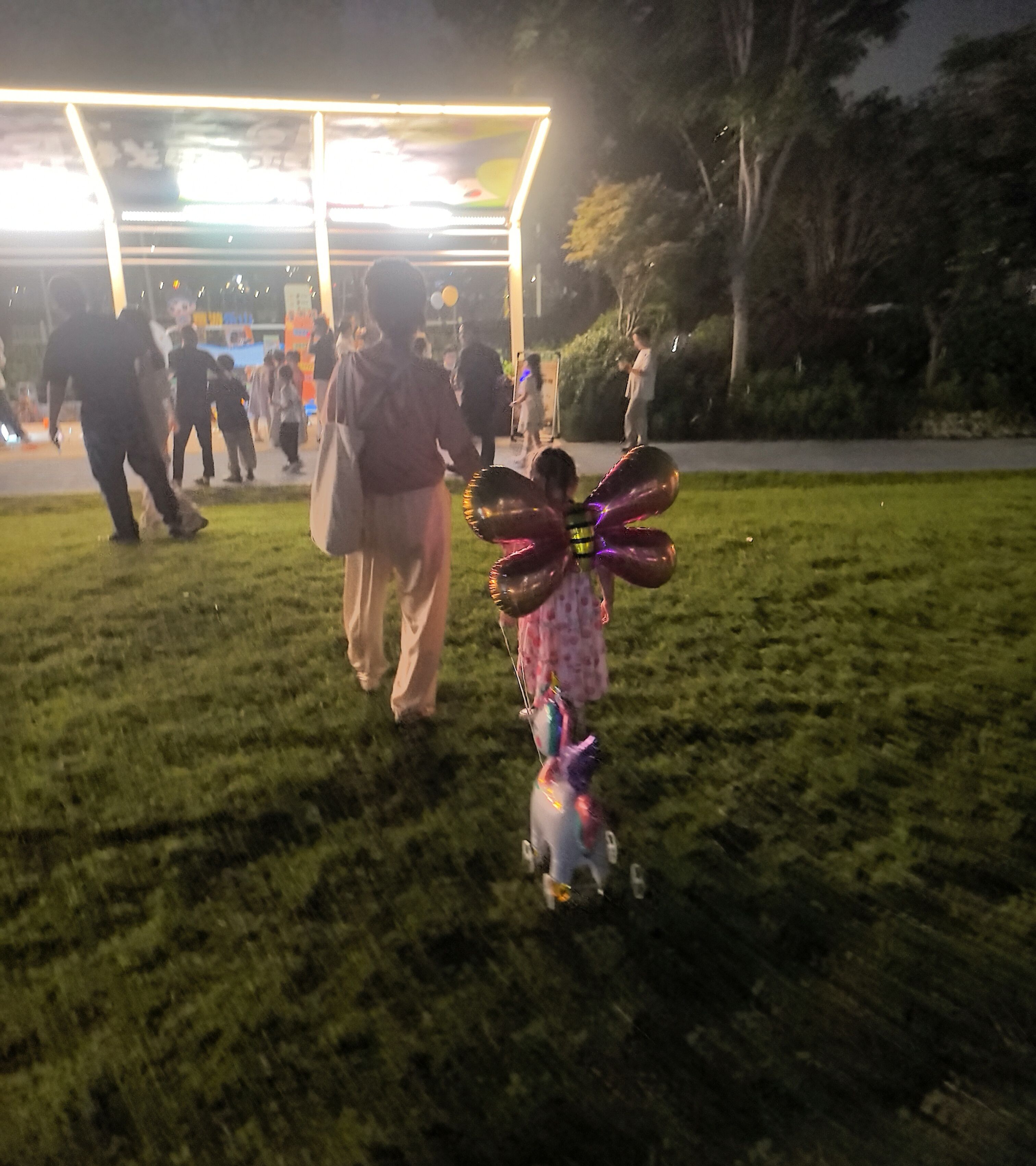 看了才知道,是妇联、街道和附近的大学师范学院、幼儿园联合举办的嘉年华晚会。公园里几乎都是年轻的父母带着孩子来参加。小孩子都穿着气球的翅膀,牵着气球小马,兴高采烈的跑来跑去。