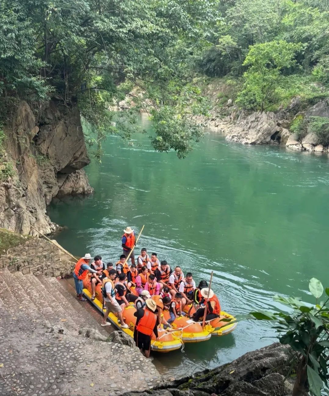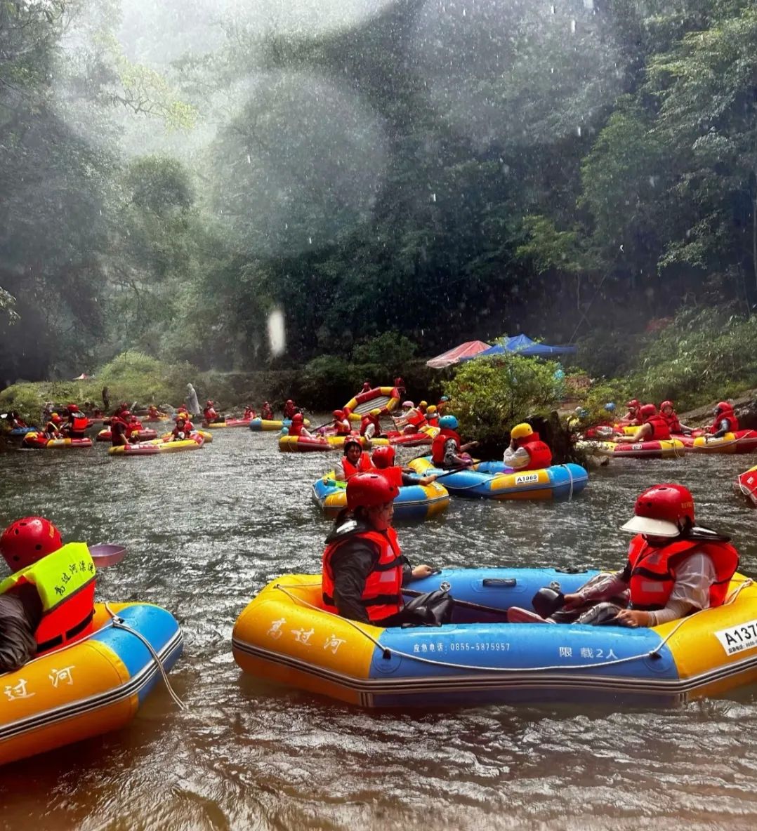 漂流途中穿行原始森林峡谷,两岸红豆杉、银杏等珍稀古木遮天蔽日,飞瀑从崖壁直泻入河,平缓段可静赏兰花峭壁、深潭碧水,动静结合宛如“闯进西游记的取景地”。