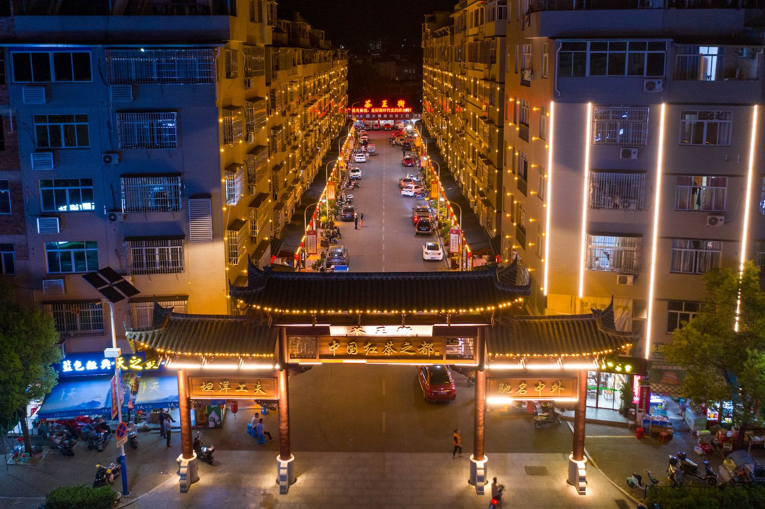 福安「茶王街」位于城阳镇岩湖村,毗邻富春茶城茶叶交易市场,由岩湖村安置房沿街门面改造而成。通过对门楼、人行步道、夜景等工程的提升,以及“茶文化主题公园”的建设,「茶王街」已经是名副其实的夜游人聚集,也是爱茶人的必打卡点!