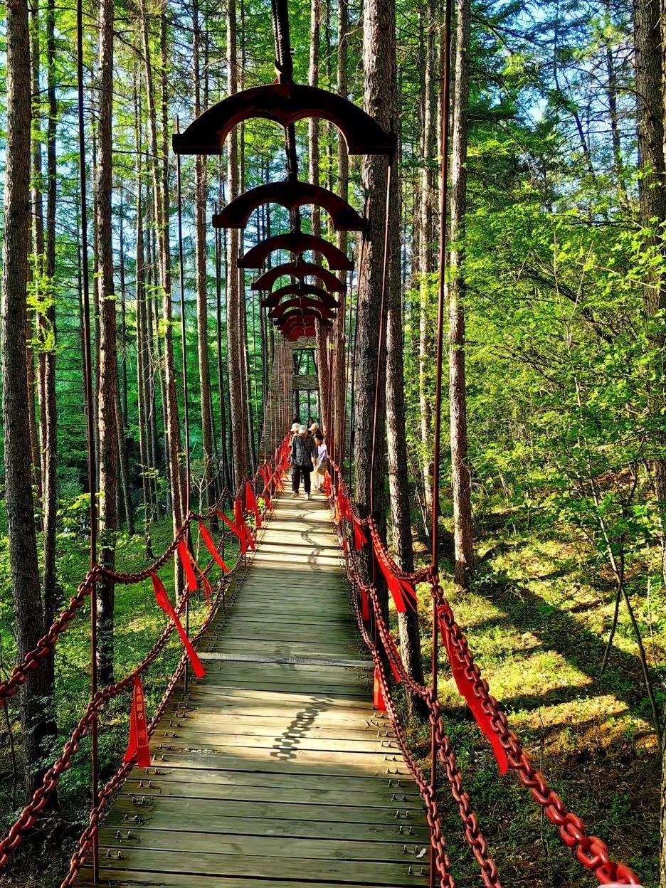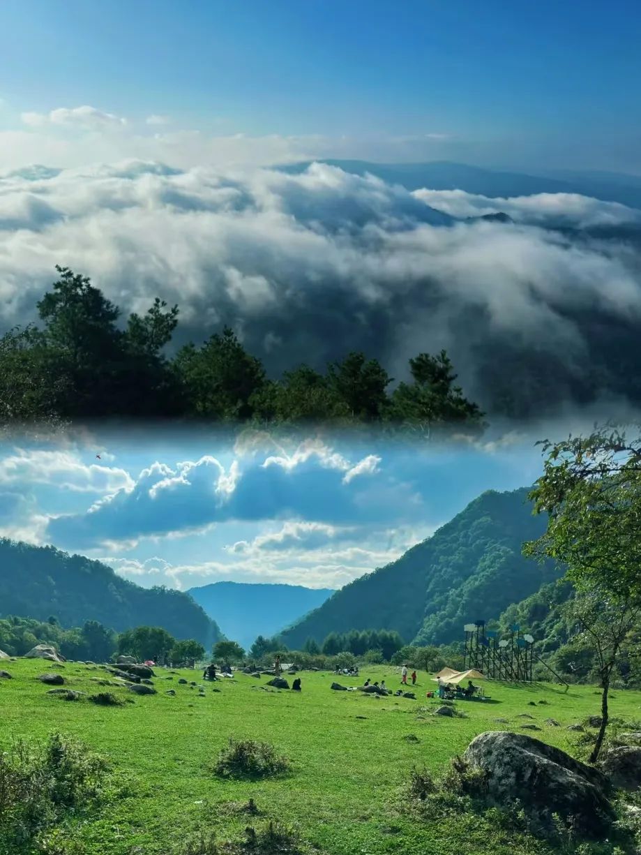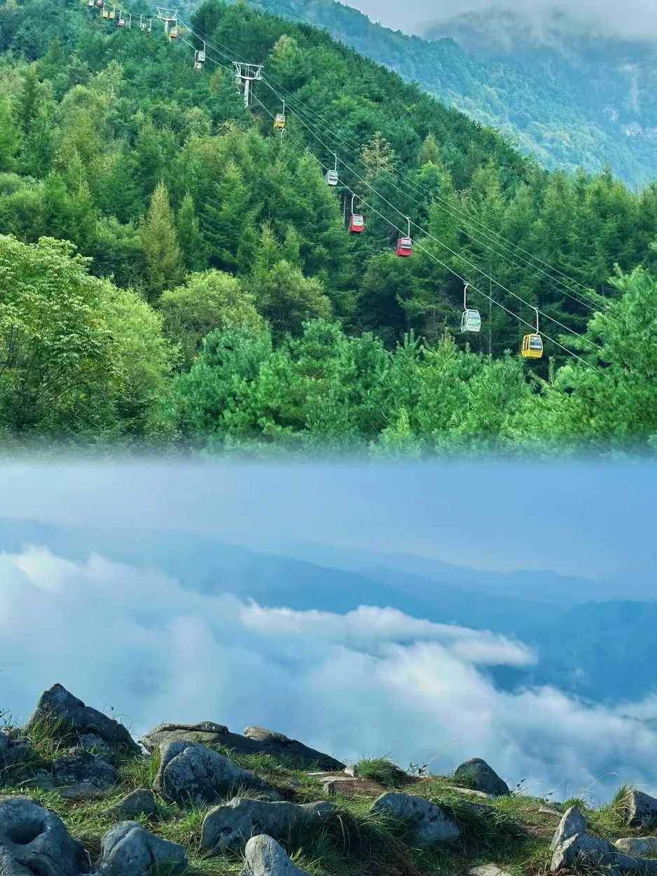 **紫柏山秘境**:乘缆车登顶,漫步亚洲第一天坦草甸,云海触手可及!下山直奔 **情人谷**,百米吊桥+溪流冷泉,仙气拉满!