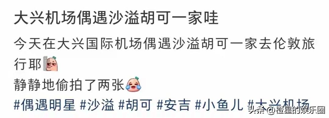 “快看,那是不是沙溢?后面那俩小巨人是他儿子?”——大兴机场VIP通道,口罩也遮不住的八卦魂。网友手一抖,把沙溢一家四口怼脸拍成“谍战片”:胡可束脚牛仔裤+帆布鞋,背影直接女大学生;安吉一身黑口罩,鸭舌帽下露出下颌线,锋利得能削薯条;小鱼儿壮到把双肩包背成儿童款,一家子浩浩荡荡杀向伦敦,登机牌还没掏,热搜先安排上了。