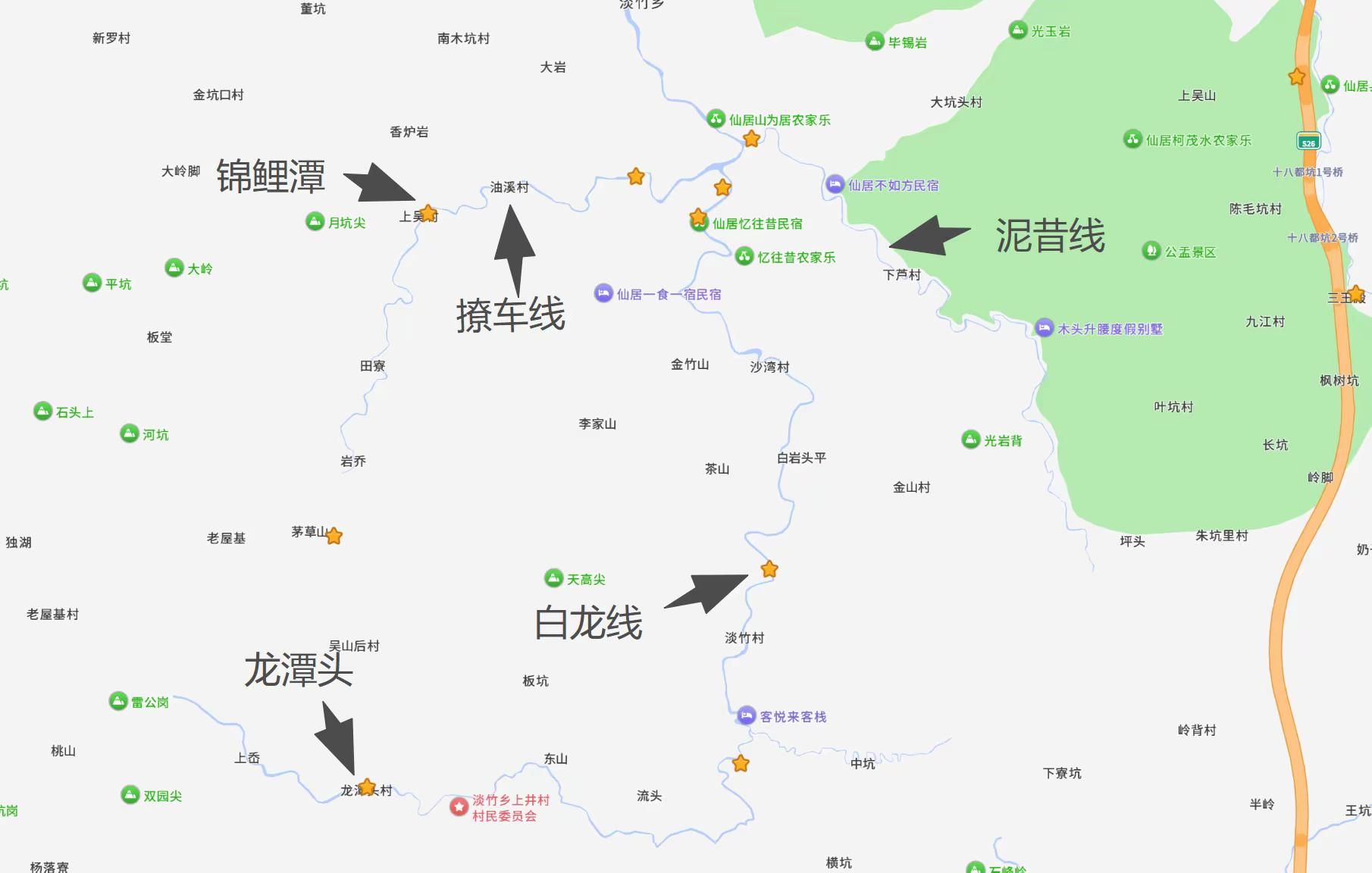仙居淡竹玩水攻略。仙居淡竹应该算是江浙沪的玩水胜地了,这里有绵延几十公里的玻璃水,可以在清澈的溪流抓小鱼、翻螃蟹,甚至和成群的锦鲤一起游泳。 最重要的是:完全免费! 不要门票,付个10-20元的停车费就能随便玩。 也因为免费,淡竹每到暑假必然大堵车,热门的玩水点天天下饺子。 其实淡竹玩水的地方很多,而且基本都在路边,在附近村民院前把车一停就能玩,没必要都去锦鲤潭和龙潭头人挤人。 1.具体的玩水点可以看图,白龙线、撩车线和泥昔线,三条路都是沿河铺设的,你就沿河开,看到人少水美的地方,把车停到附近停车场就能随便玩水了。 不要在路边乱停车!淡竹都是乡道,本来就比较窄,乱停车很容易导致堵车,结果就是大家都过不去。遇到暴脾气的老哥,还可能给你放气,甚至推河里。 “这种事你们可以花点钱嘛,花点儿”,10-20元就能停一天。 2.分享个简单的找水方法,河流拐弯的地方水流比较急,容易把小石子冲到岸边,久而久之就会形成深潭。所以你可以看地图上河流有拐弯的地方,像图,这些地方比较容易找到好的玩水点。 3.也可以直接导航最远的龙潭头,路上看到有合适的水潭都能玩。 下面是一些比较出名的玩水点:圳口大桥(最近)、龙潭头(最远)、撩车村、锦鲤潭、大源村、张滩等,不必执着去这些地方,路上有合适的都能玩。 4.玩水的朋友请爱护环境,不要乱扔垃圾,只有保护好清澈的溪流才能一直玩嘛~ 最后:野外玩水一定要注意安全,溪水清澈,经常会出现肉眼能看到底的地方,却好几米深,一不注意就会溺水。 一个明显的标志就是:水越绿越蓝的地方就越深。不要靠近!#玩水 #玩水的季节 #玻璃水 #夏日 #仙居