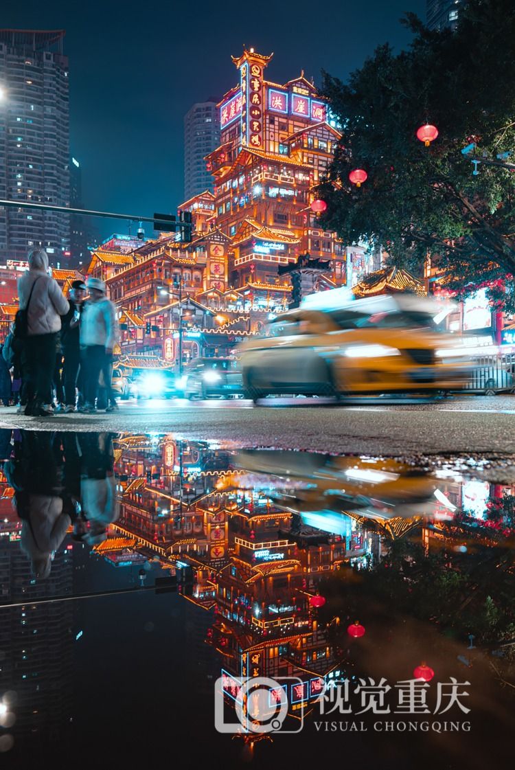 《镜像洪崖洞》: 街边的红灯笼与洪崖洞的璀璨灯光倒映在水中,形成了一幅绝美的镜像画面。洪崖洞的巴渝传统建筑特色吊脚楼在灯光的勾勒下,仿佛是现实版的“千与千寻”城堡,如梦如幻。