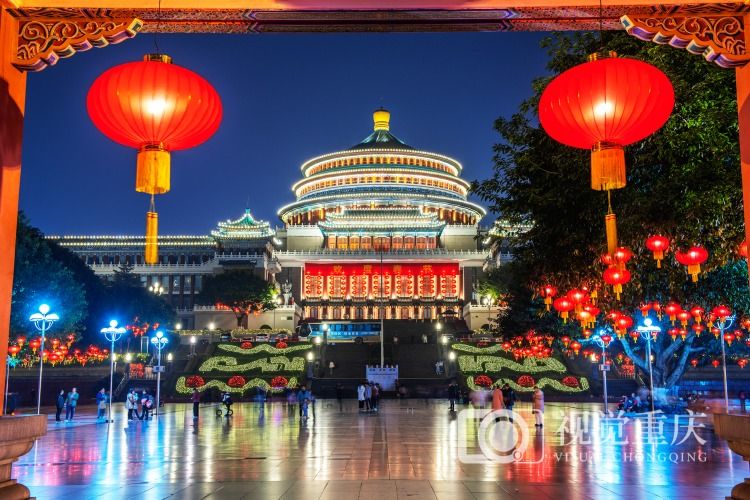 《重庆人民大礼堂 新年之夜》: 重庆人民大礼堂在各色灯饰与道路、楼体景观灯的相互映衬下,显得格外庄重而美丽。大红灯笼高高挂起,为这座宏伟的建筑增添了一抹浓浓的中国风色彩。