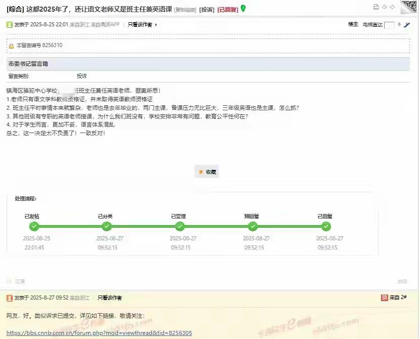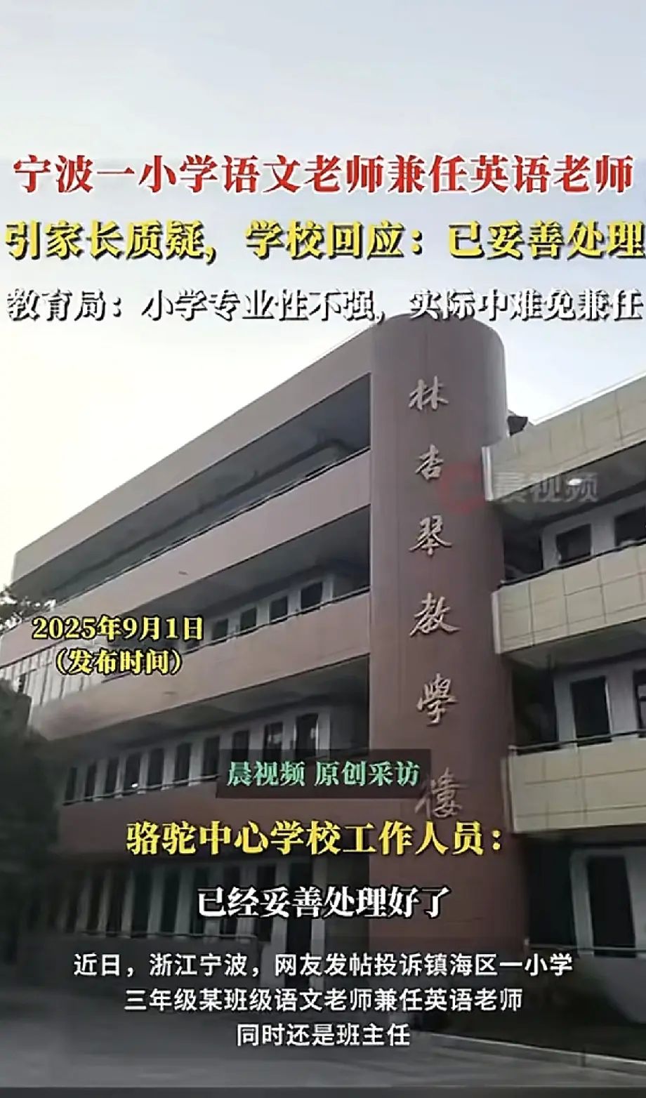 近日,浙江宁波镇海区骆驼中心学校一起师资安排事件引发广泛关注。有网友发帖投诉,该校三年级某班的英语课由语文老师兼任,且这位老师同时担任班主任,而其他班级都配备了专职英语老师。这一差异引发了家长对教育公平和教学质量的担忧,迅速在网络上掀起讨论热潮。