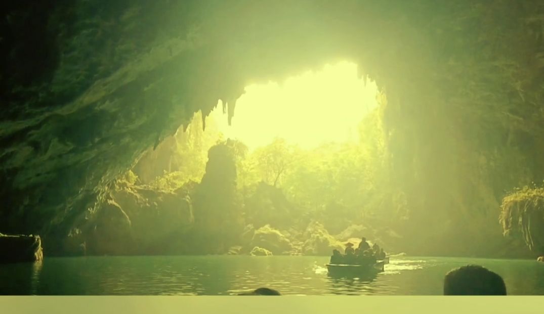 行至洞中段,前方忽然透出光亮——那是岩顶的天窗。阳光从数十米高的洞口倾泻而下,在河面投下一道金色的光柱,浮尘在光里跳舞,连空气都变得透亮。此时再看岩壁,竟泛着淡淡的赭红与米白,那是亿万年水流冲刷的痕迹,有的像展翅的凤凰,有的像蜷缩的灵龟,在光影里变幻出万千模样。撑筏人说,这洞有“三明三暗”,每过一道天窗,便是一次明暗交替,仿佛穿越了昼与夜。
