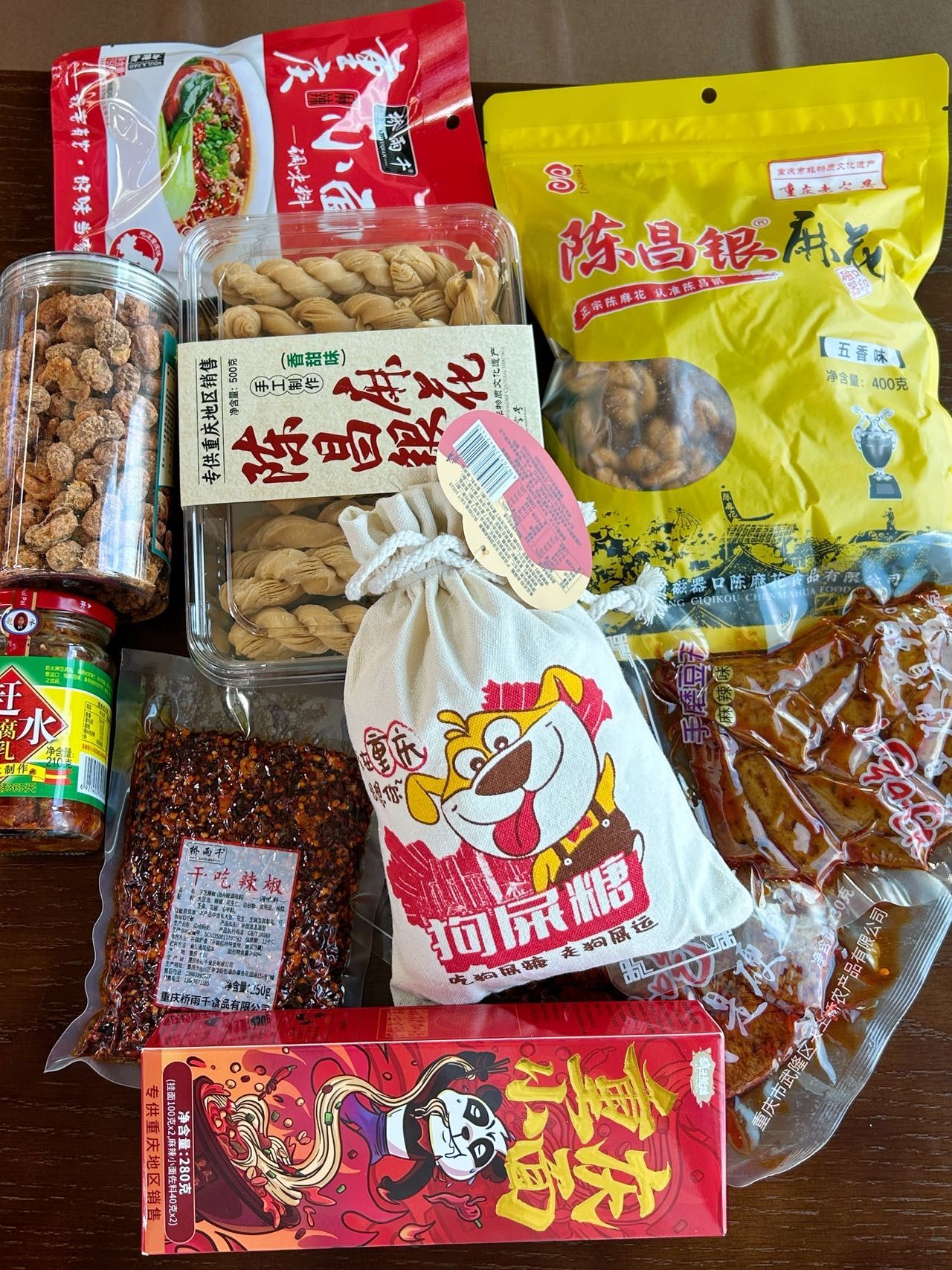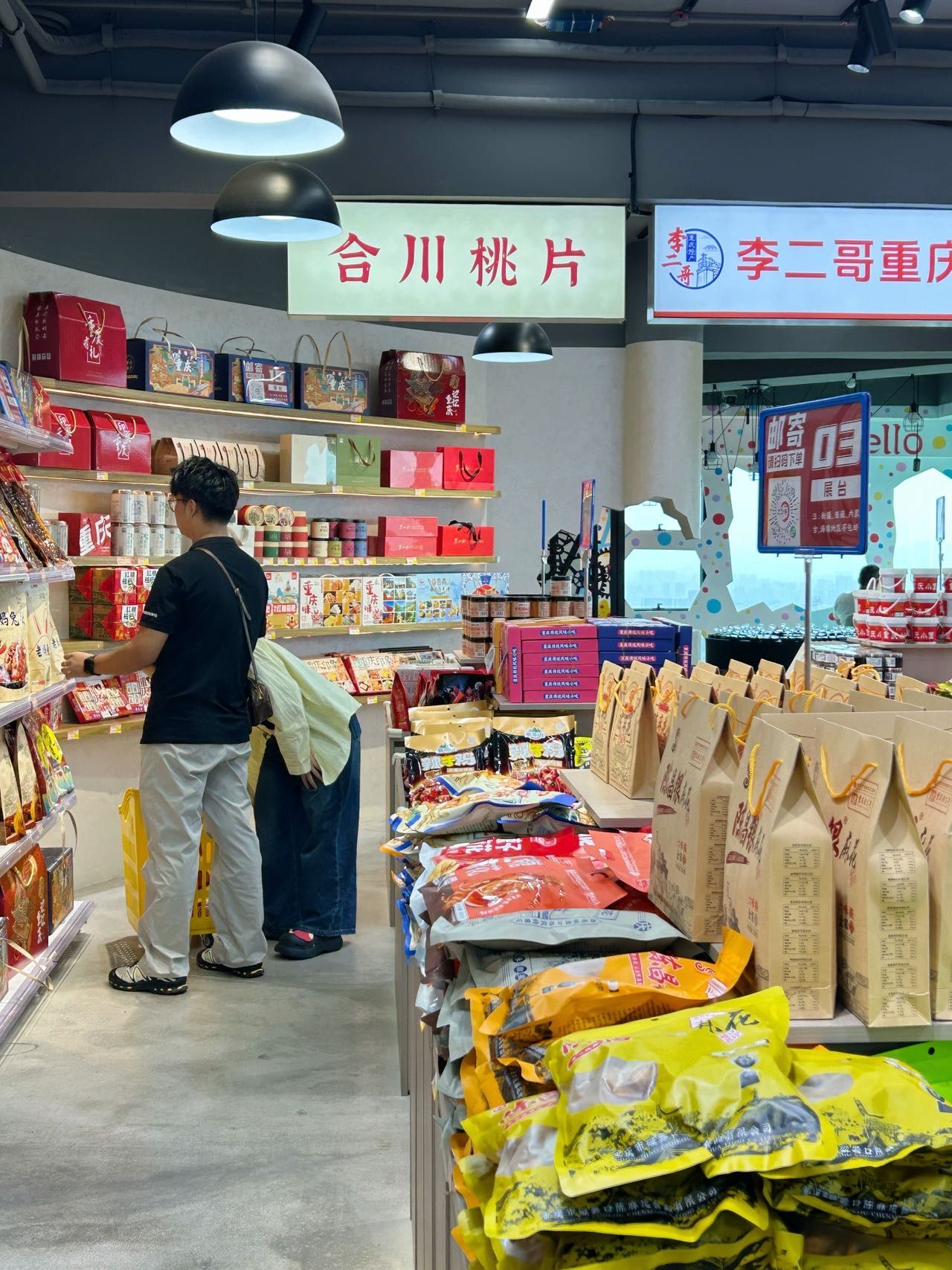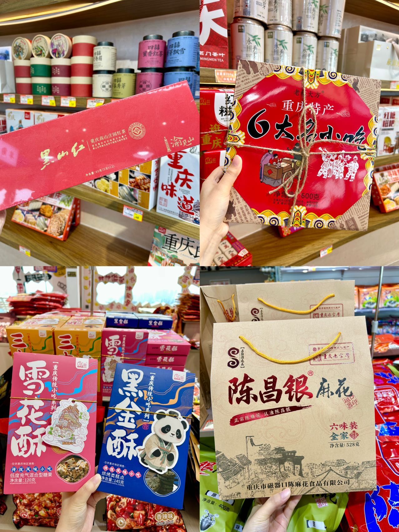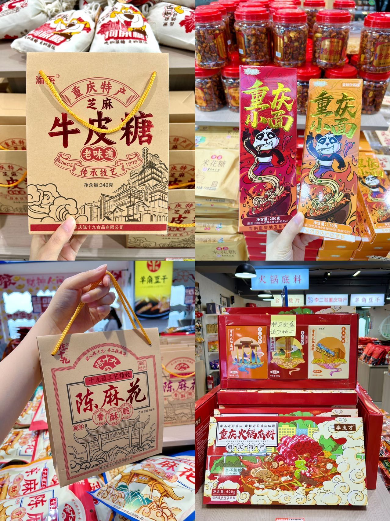 想带啥这儿都有!麻辣口的火锅底料、小面调料、灯影牛肉丝是标配,还有不辣星人也爱的合川桃片、陈麻花、怪味胡豆,连江津米花糖这种老重庆记忆款都能找到。