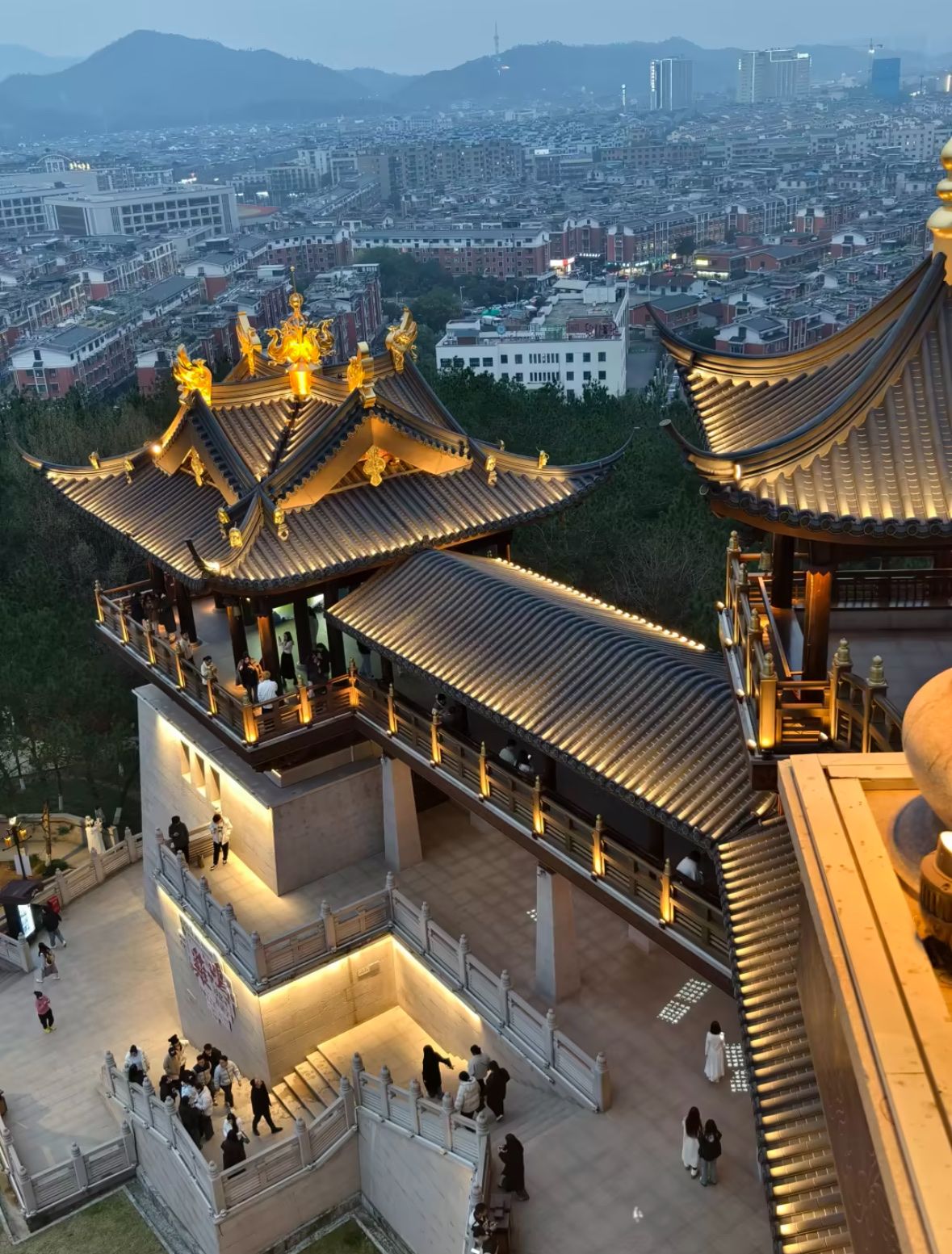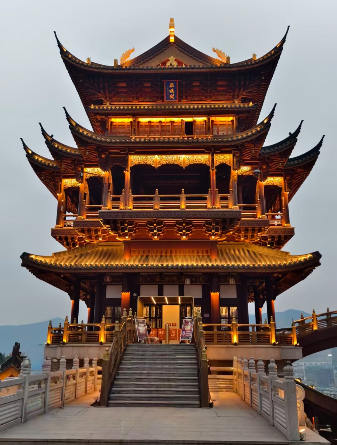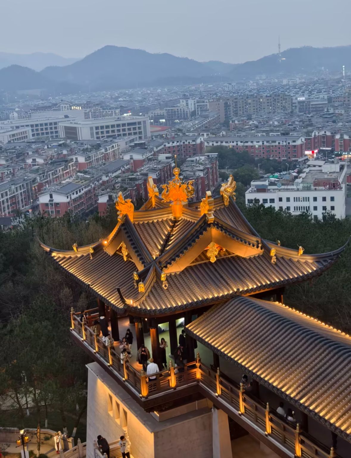 从远处看,鸡鸣阁的主楼飞檐翘角,层层出挑的斗拱搭配升起的翼角,像一只即将腾飞的凤凰。走进其中,更能感受到它的独特韵味。一层以下主体外装饰及屋面用的仿古铜艺饰件,斗拱、额枋等都严格遵循古建筑形制,满满的古韵。登上鸡鸣阁,俯瞰义乌城区,白日车水马龙,夜晚灯火辉煌,美不胜收。我去的时候是日落时分,余晖洒在阁楼上,那景色,绝了!随便一拍都是大片。晚上亮灯后,更是美得像梦幻盛景,穿上汉服拍照,仿佛穿越时空。