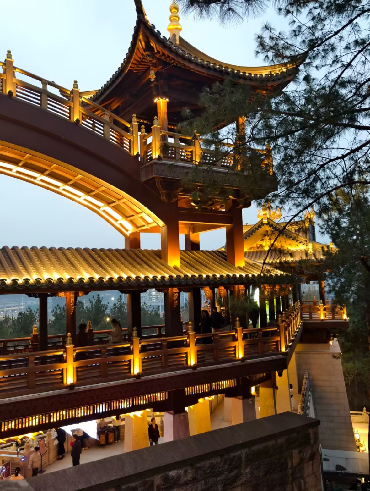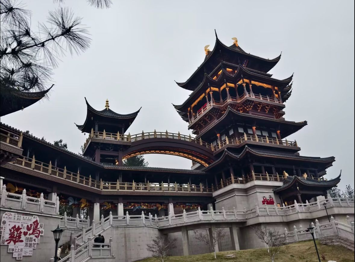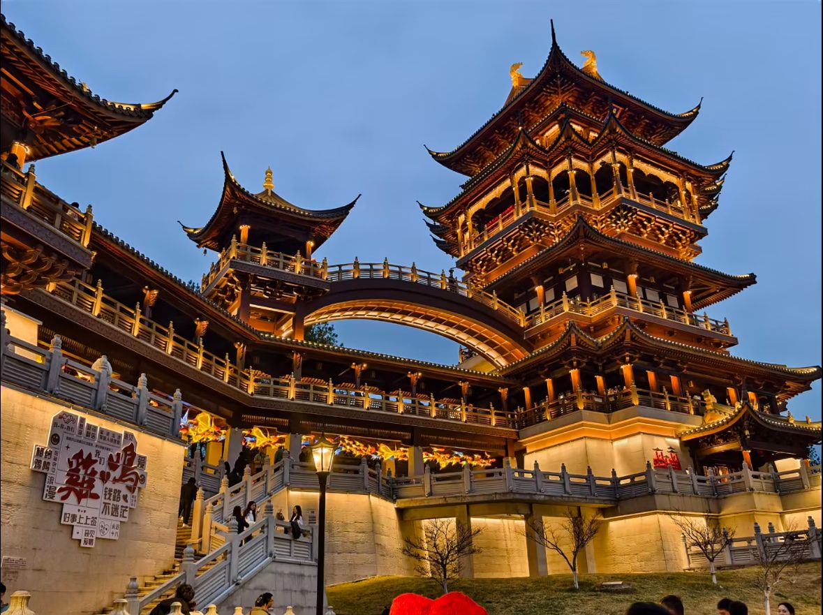 从远处看,鸡鸣阁的主楼飞檐翘角,层层出挑的斗拱搭配升起的翼角,像一只即将腾飞的凤凰。走进其中,更能感受到它的独特韵味。一层以下主体外装饰及屋面用的仿古铜艺饰件,斗拱、额枋等都严格遵循古建筑形制,满满的古韵。登上鸡鸣阁,俯瞰义乌城区,白日车水马龙,夜晚灯火辉煌,美不胜收。我去的时候是日落时分,余晖洒在阁楼上,那景色,绝了!随便一拍都是大片。晚上亮灯后,更是美得像梦幻盛景,穿上汉服拍照,仿佛穿越时空。