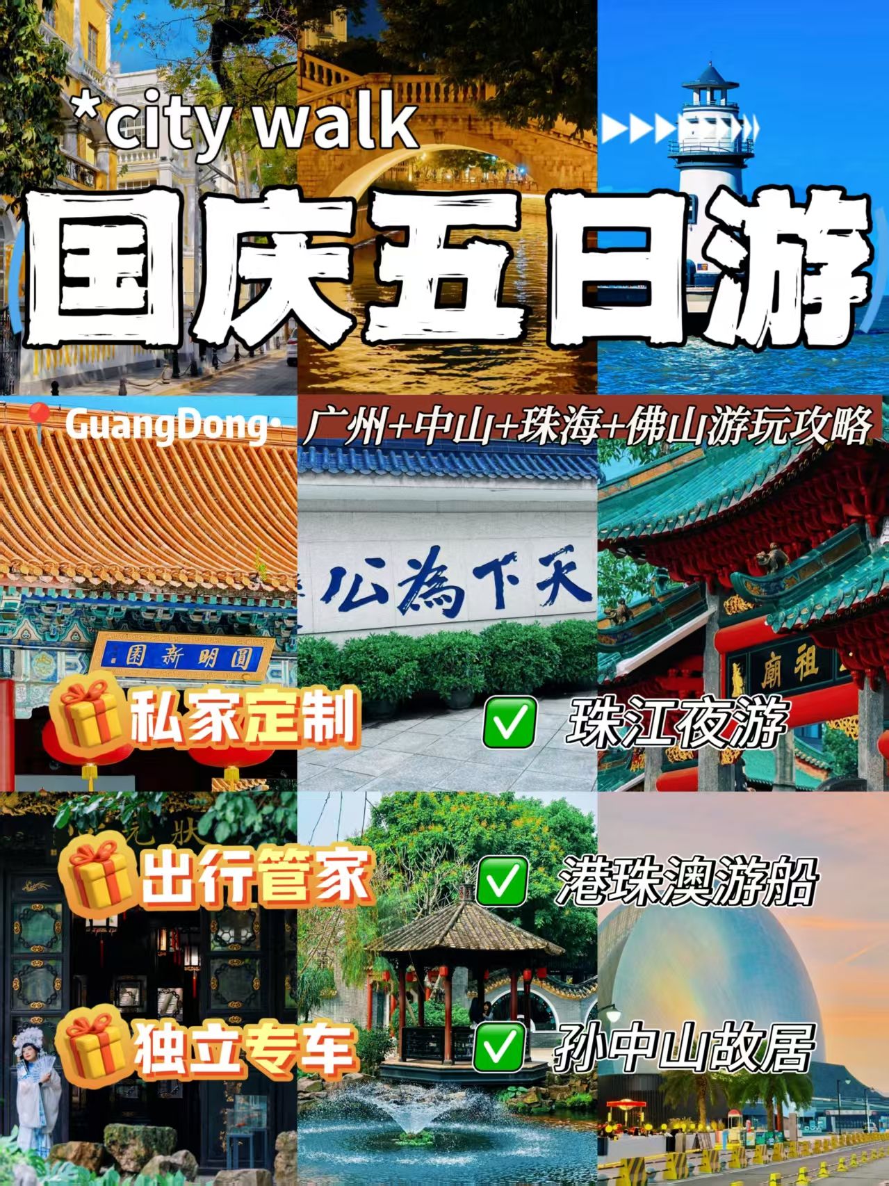 不想国庆人挤人?那就选【私享一家一团】的大湾区四城漫游!广州、中山、珠海、佛山深度打卡,全程独立专车+四钻酒店,出行管家贴心服务,舒适感直接拉满~