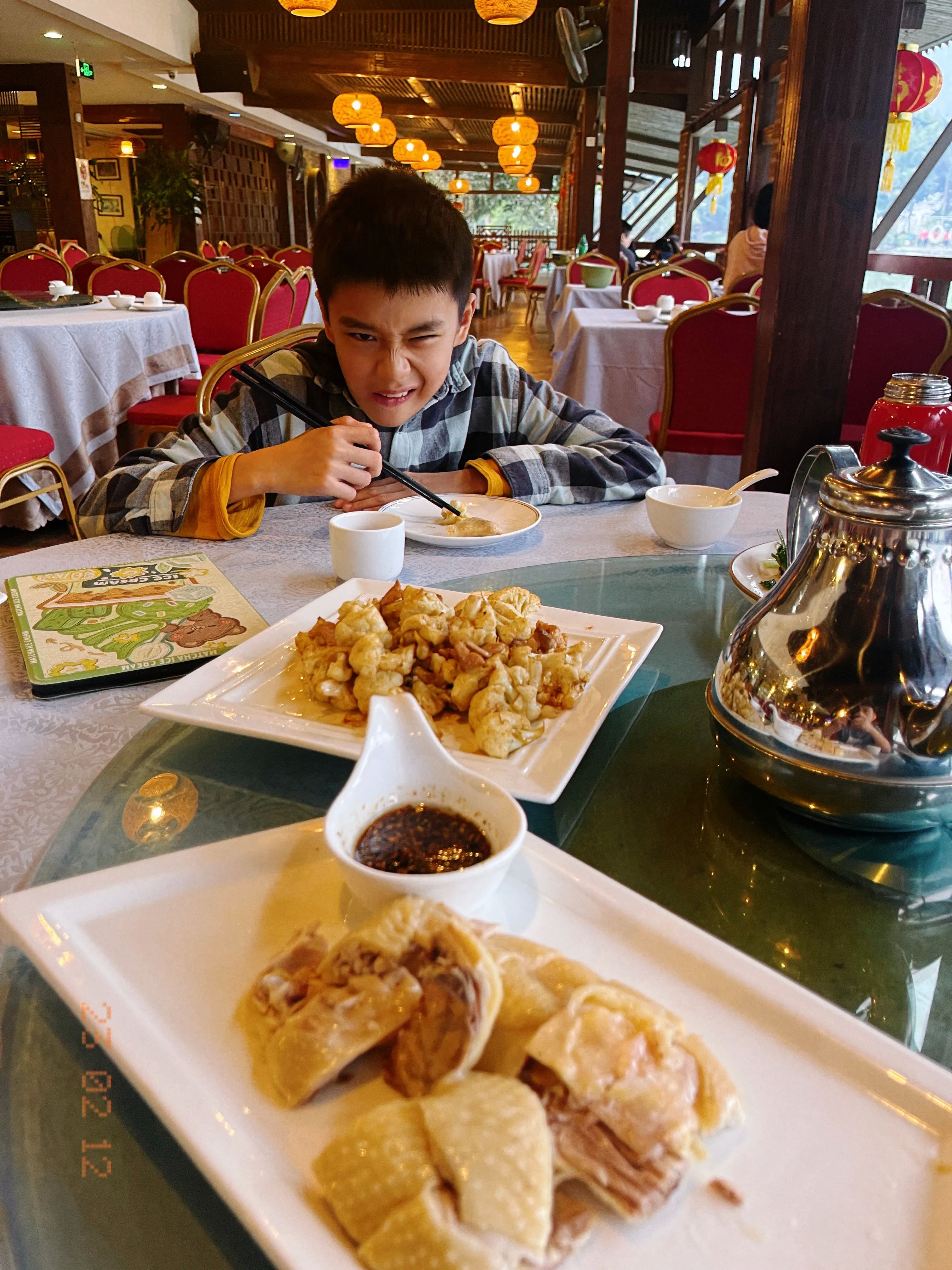 泳池早餐采用定食制,餐品丰富,水果一半是葡萄和哈密瓜,门口大厅果盘的橘子、青果等时令水果也可免费随意取用。不够的点心可以随意加(饺子和烧卖可以多加三个,再多就不可以了),但是记得不要浪费。不爱吃炒粉可以选择汤粉。中餐和晚餐提供点菜、烧烤(烤猪/烤鸡啥的)、火锅等,道地的广西风味。