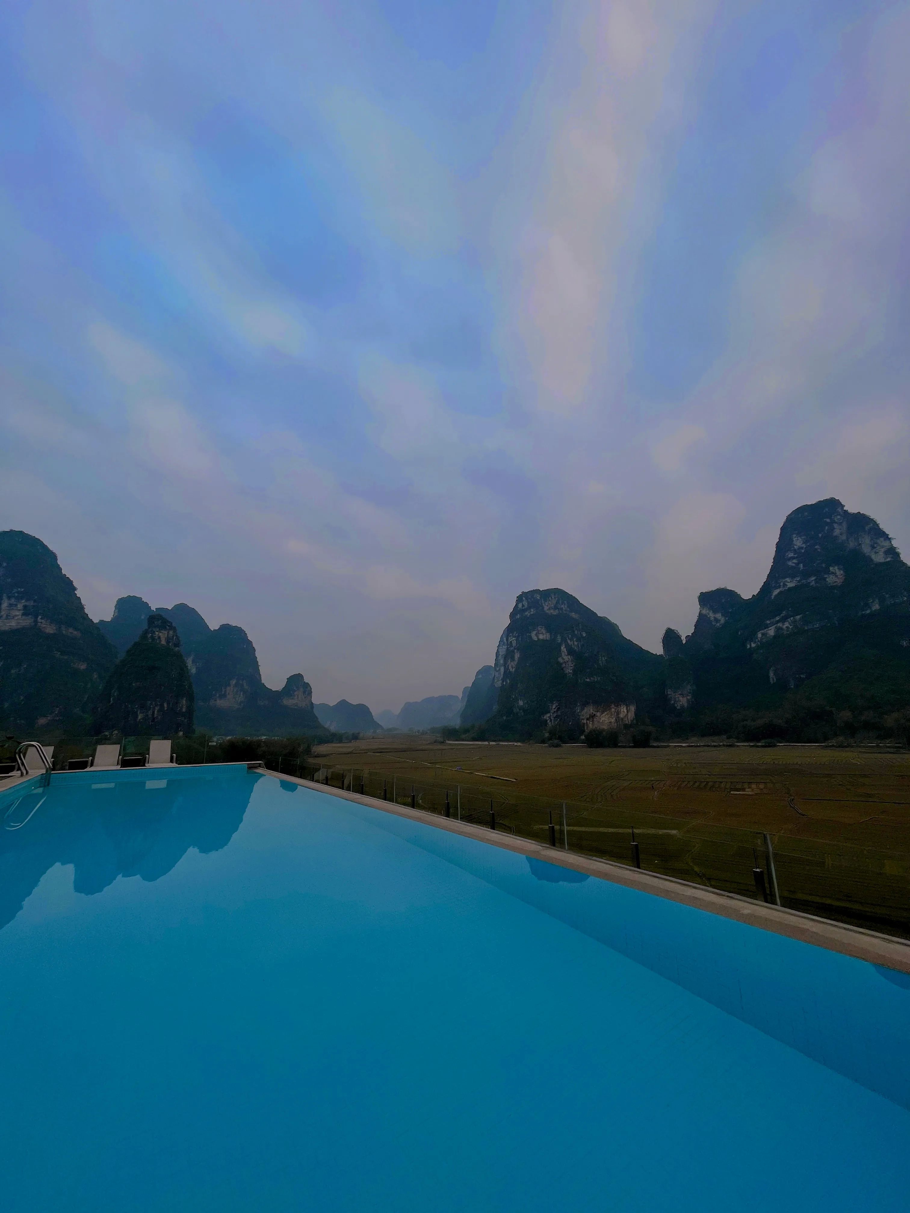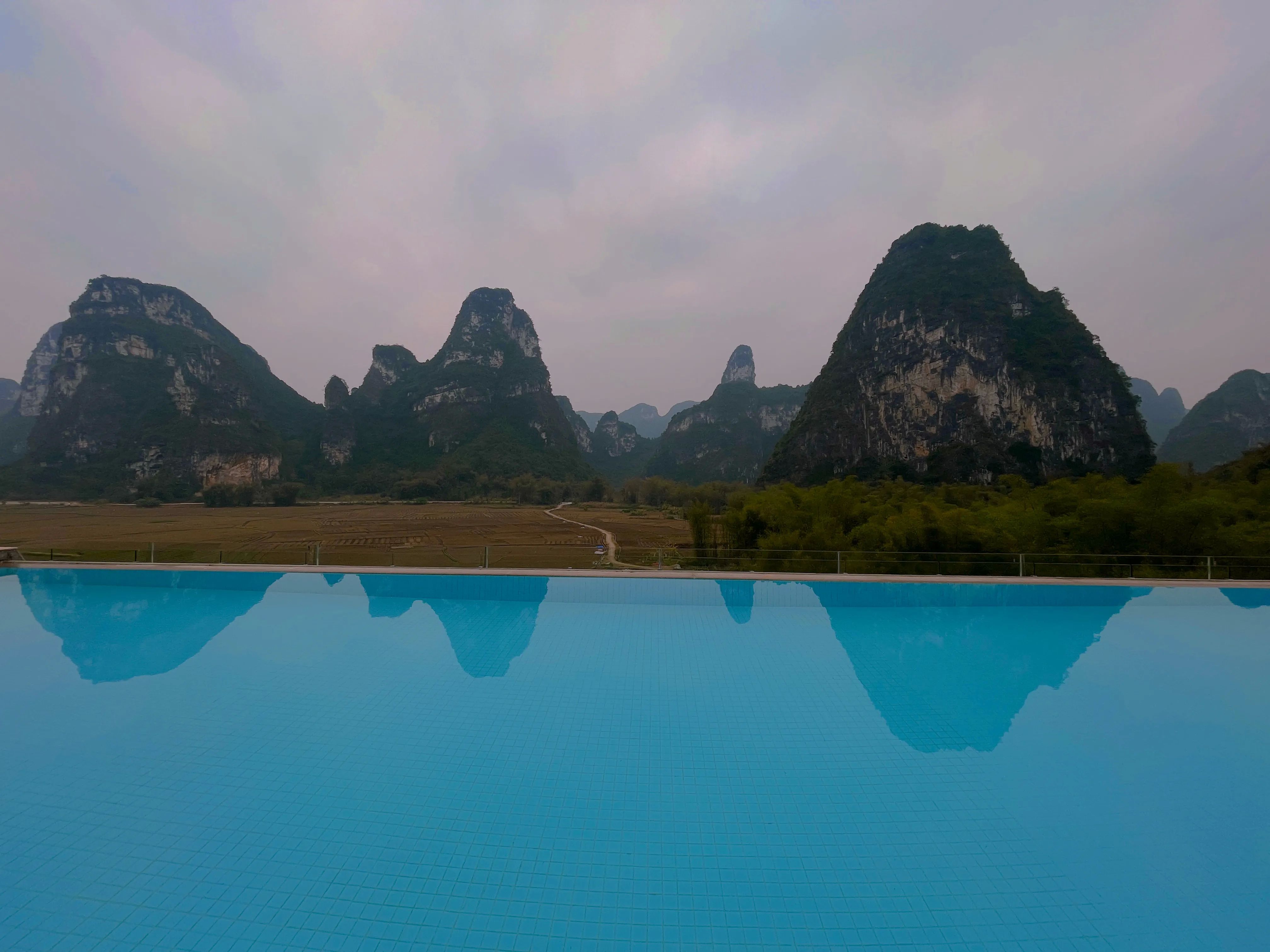 从精品民宿的角度讲,花庐几乎无懈可击。酒店四周都是风景旖旎的喀斯特地貌,还有原生态的农田,处处皆景致。顶楼的无边泳池视野好,也是网红打卡的胜地。一楼大堂的公区兼顾了大堂吧、餐厅、小憩、会客、办公等多种用途,接待人员也是相当纯熟(指的是业务方面)、老练、礼貌。