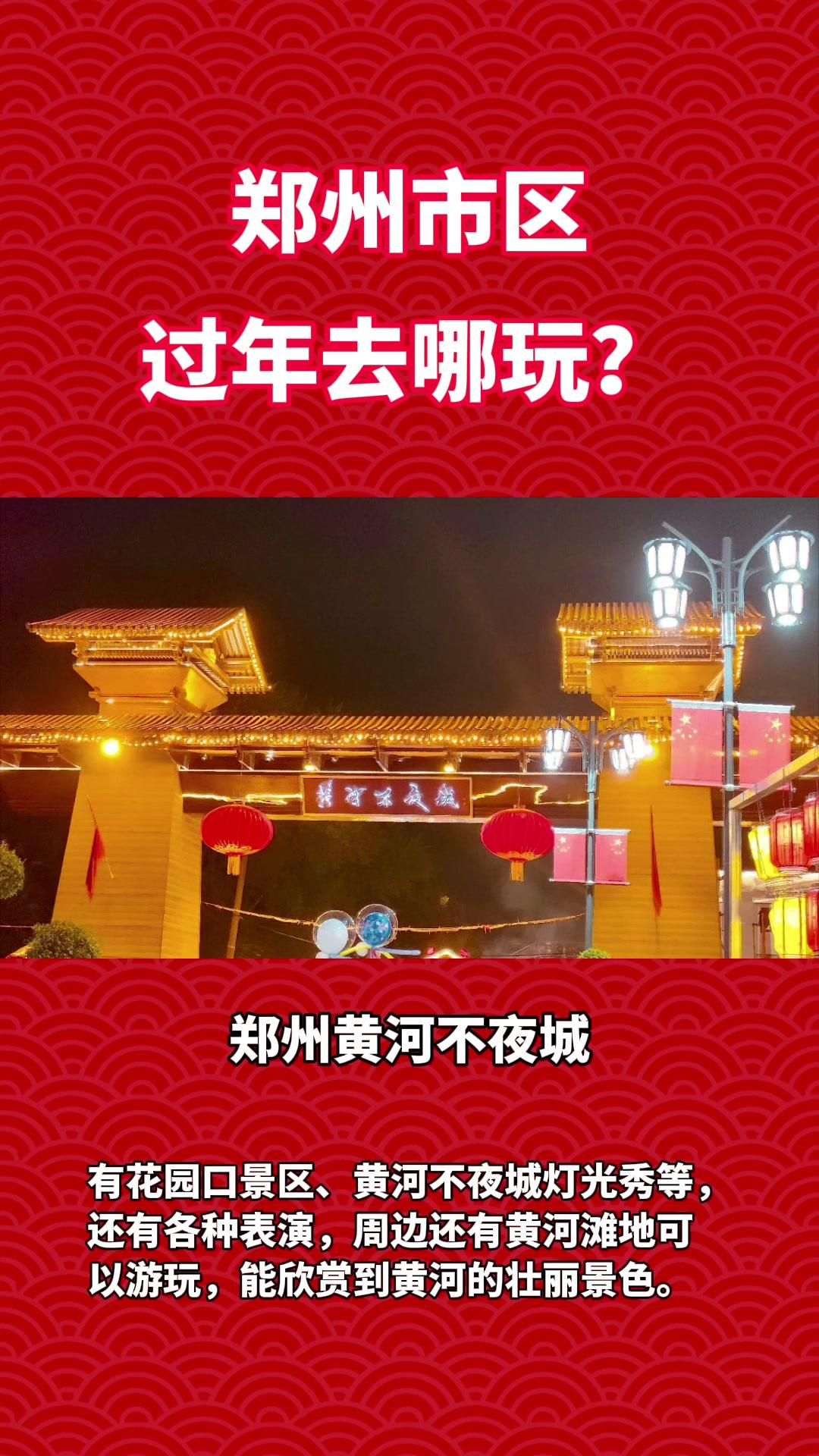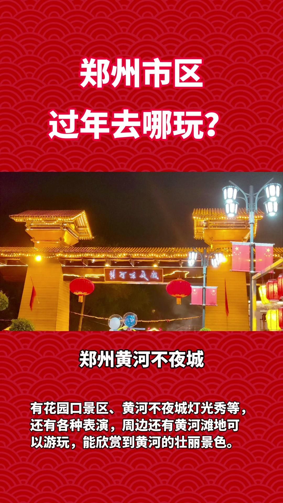 郑州黄河不夜城:有花园口景区、黄河不夜城灯光秀等,还有各种表演,周边还有黄河滩地可以游玩,能欣赏到黄河的壮丽景色。