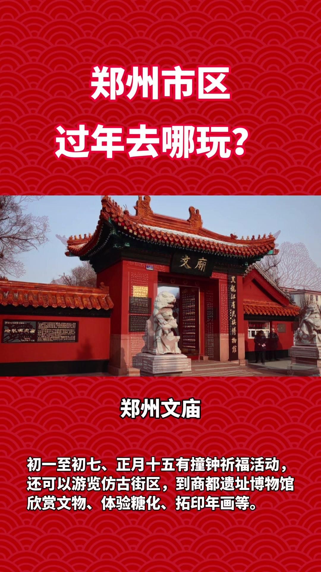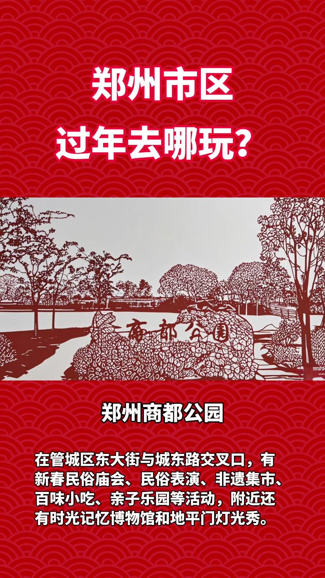 郑州商都公园:位于管城区东大街与城东路交叉口,有新春民俗庙会、民俗表演、非遗集市、百味小吃、亲子乐园等活动,附近还有时光记忆博物馆和地平门灯光秀。
