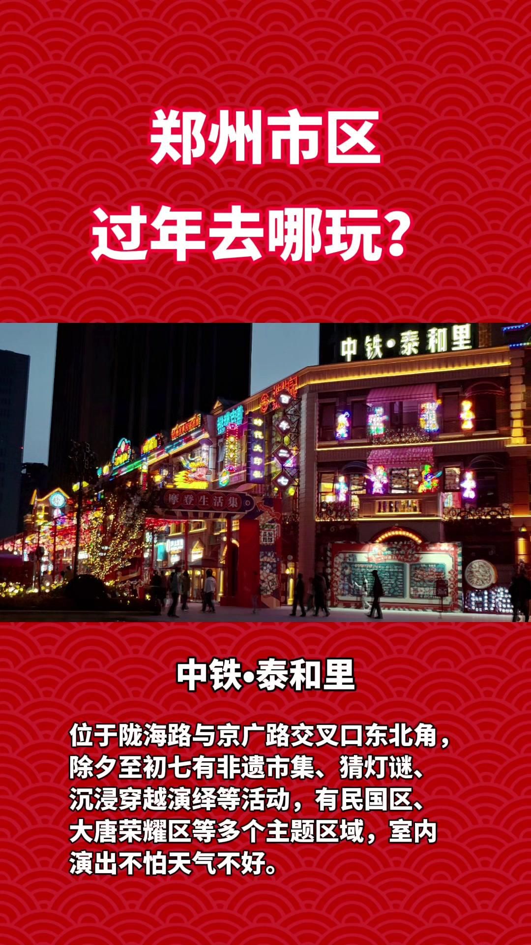 郑州市区过年去哪玩?中铁·泰和里:位于陇海路与京广路交叉口东北角,除夕至初七有非遗市集、猜灯谜、沉浸穿越演绎等活动,有民国区、大唐荣耀区等多个主题区域,室内室外活动丰富多彩。