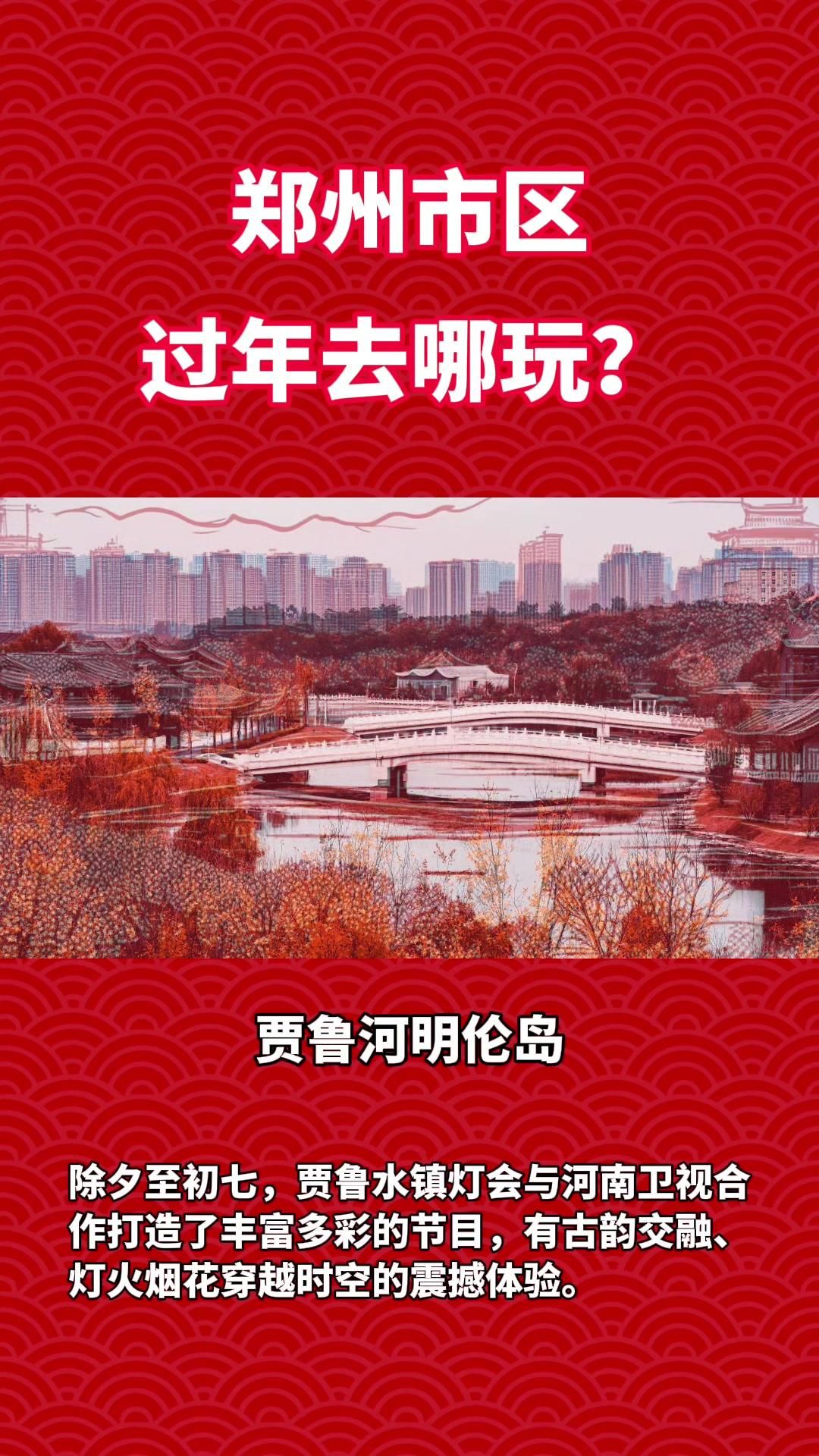 贾鲁河明伦岛:除夕至初七,贾鲁水镇灯会与河南卫视合作打造了丰富多彩的节目,有古韵交融、灯火烟花穿越时空的震撼体验。