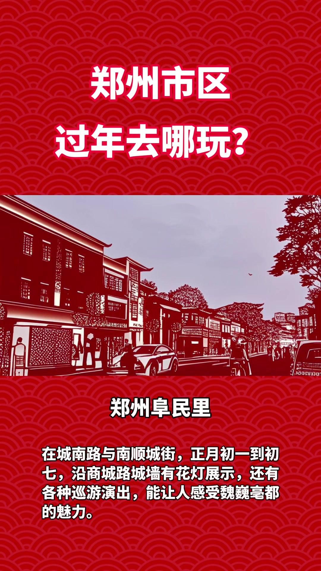 郑州阜民里:位于城南路与南顺城街,正月初一到初七,沿商城路城墙有花灯展示,还有各种巡游演出,能让人感受魏巍毫都。
