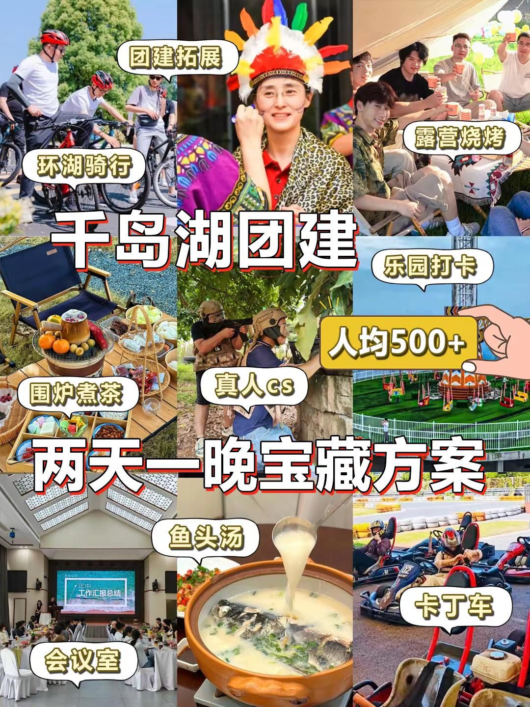 千岛湖两天一夜团建方案人均500+HR速藏! 千岛湖的深秋,湖光潋滟,层林尽染,是远离喧嚣、享受宁静的理想团建目的地!户外探索星空围炉暖心热饮,一站式满足团队放松、协作与情感凝聚需求!这篇千岛湖秋季2天1夜团建攻略,HR们赶紧码住吧-【活动信息】地点:浙江•杭州•千岛湖时间:两天一夜交通:高级大巴接送人数:10-300人皆可定制杭州:2H 、上海:4H 、南京:约H-【团建活动】水上项目:皮划艇、水上闯关、桨板、摩托艇、游艇游览等。陆地活动:环湖骑行、真人CS、森林徒步、卡丁车、越野车、攻防箭等。团队协作:破冰拓展、旱地冰壶、棒球、飞盘、非洲鼓、剧本杀体验。休闲娱乐:露营烧烤、露天电影、啤酒小镇微醺体验、别墅轰趴。探险挑战:沪马探险乐园、高空拓展项目-【团建行程参考】Day:08:00-10:30 集合出发10:30-12:00 抵达千岛湖12:00-13:30 特色午餐,鱼头宴13:30-17:30 沪马探险乐园(体验惊险刺激的高空项目,玻璃观景台/超级滑板车/缆车飞渡,尽享湖景视野)17:30-19:30 湖畔露营烧烤,畅饮千岛湖啤酒19:30- 篝火晚会,自由活动,晚间休息-Day:08:00-09:00 自助早餐09:00-11:30 环湖骑行(全程15KM骑行道,穿行于千岛湖山水精华段)11:30-12:30 特色午餐12:30-15:30 啤酒小镇游览,参观啤酒博物院体验刺激卡丁车~打卡网红灯塔16:00 行程结束,返回公司-【团建热门景点】希尔顿皮划艇:环境美、水质清、玩法多,背山面湖,可满足百人以上团队活动。环湖骑行:千岛湖标志性体验。分组进行骑行比赛或慢骑赏景。卡丁车:以赛车为主题的综合性主题乐园,含卡丁车运动等,有配套餐饮等,夏日活动精彩。沪马探险乐园:包含玻璃观景台、滑板车等项目,刺激有趣。啤酒小镇:欧式风情小镇,可以品尝鲜酿啤酒,体验湖畔卡丁车,漫步浪漫灯塔步道天屿山:无需登岛,轻松乘车直达。拥有超赞的俯瞰千岛湖大桥和日落视角,适合团队观景和放松。#上海团建 #江浙沪团建 #杭州团建 #千岛湖团建 #千岛湖