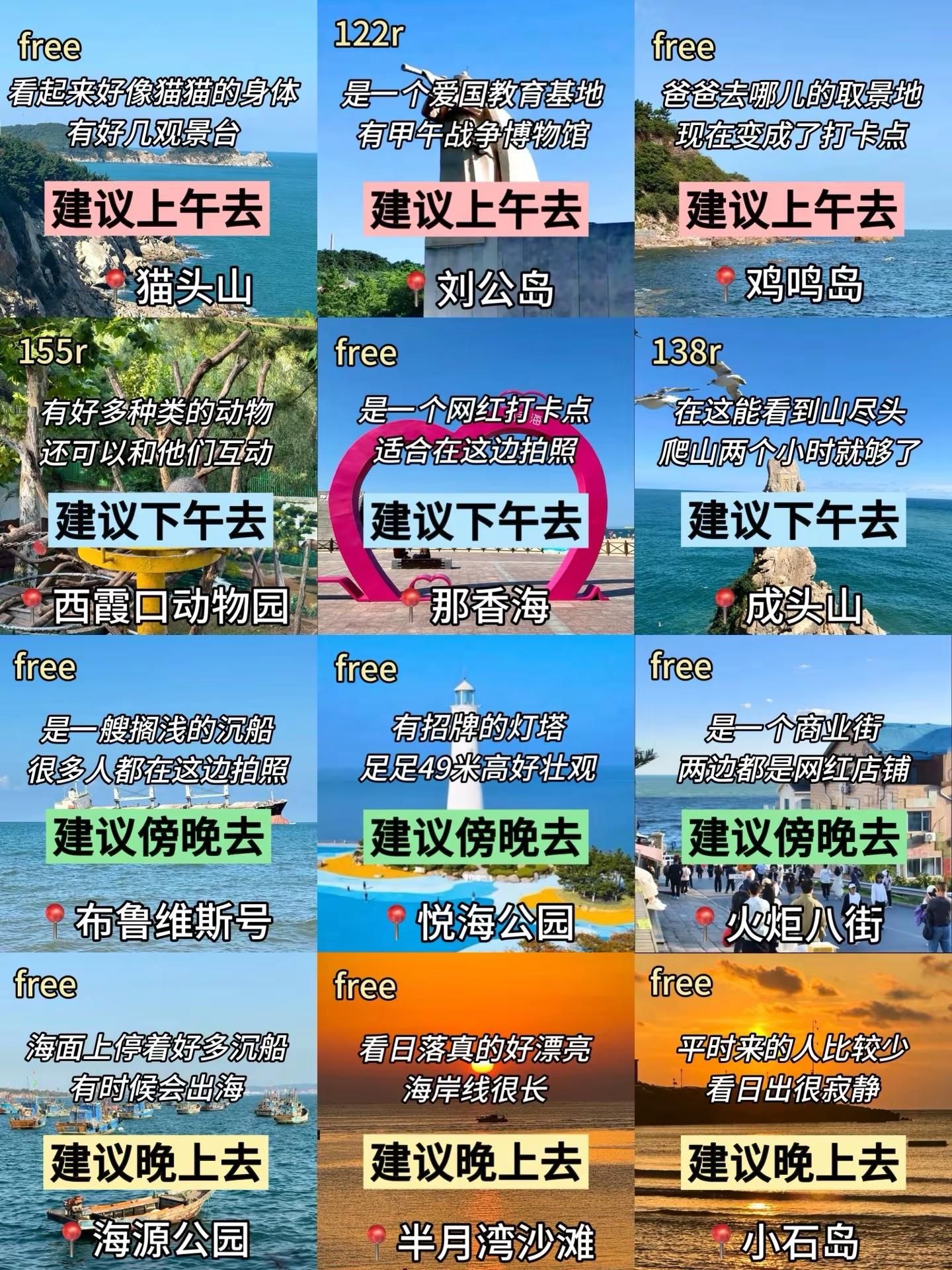 10月去威海旅游不看这篇攻略真的会哭。真的要趁着10月份温度合适去一次威海!现在的威海天气适中,景点的人也不算多,酒店也比之前便宜了好多,特意整理了这份超详细威海玩法,建议收好--【关于威海景点】悦海公园:来这边主要就是拍灯塔的,有足足49米高,还有不少秋千,在这边蛮惬意的。刘公岛:是需要坐船上岛的,去之前先看看天气,遇到阴雨天气会停航,岛上主要就是一些历史遗迹。幸福门:据说踏过幸福门就是寓意着幸福,下面还有一个万福图,在楼下拍拍这两个景点就好了,没必要上去。半月湾沙滩:来这边看日出真的绝美,因为海岸线很长,能看到太阳一点点从海面上升出来。猫头山:从远处看过去就像一只趴着的猫猫,每个观景台看过去风景都不一样,二三号观景台视野很全。火炬八街:虽然是一条商业化的街,但是站在路的尽头看大海真的好有感觉,房子基本上都是黄蓝的。鸡鸣岛:之前是一个小渔村,后面因为爸爸去哪儿火起来的,岛上到处都是绿油油的,还有蓝蓝的大海。布鲁维斯号:来荣成必打卡的景点,是一艘搁浅的沉船,晴天和阴天来拍照完全是两种感觉。西霞口动物园:这边是分主题的,建议把行程放到上午,大熊猫在上午很活跃,会吃竹子晒太阳什么的。#威海攻略 #威海 #威海旅游攻略 #山东威海 #威海网红打卡地