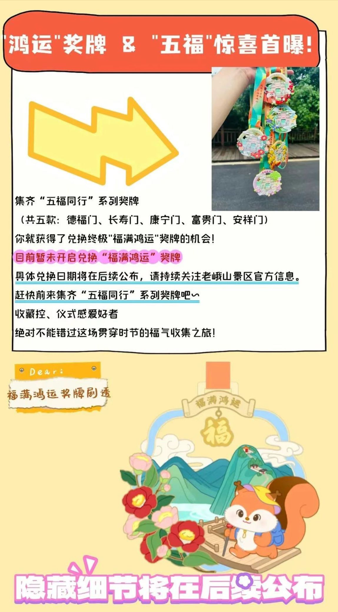 据景区公众号上的最新消息(图2),集齐一套(5款)奖牌(图1)后期可以兑换到“福满鸿运”特别奖牌(期待ing)
