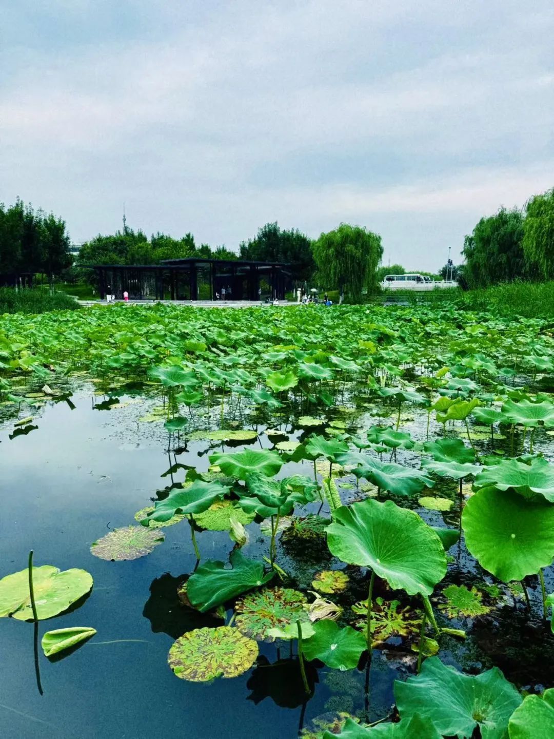 穿过公园入口的树荫,大片荷塘便撞入眼帘,这是夏日最慷慨的馈赠。此时的荷花正进入盛放期,粉白相间的花瓣从层层叠叠的绿荷中探出头,风过时,叶浪裹挟着清甜的香气漫过来,瞬间吹散燥热。