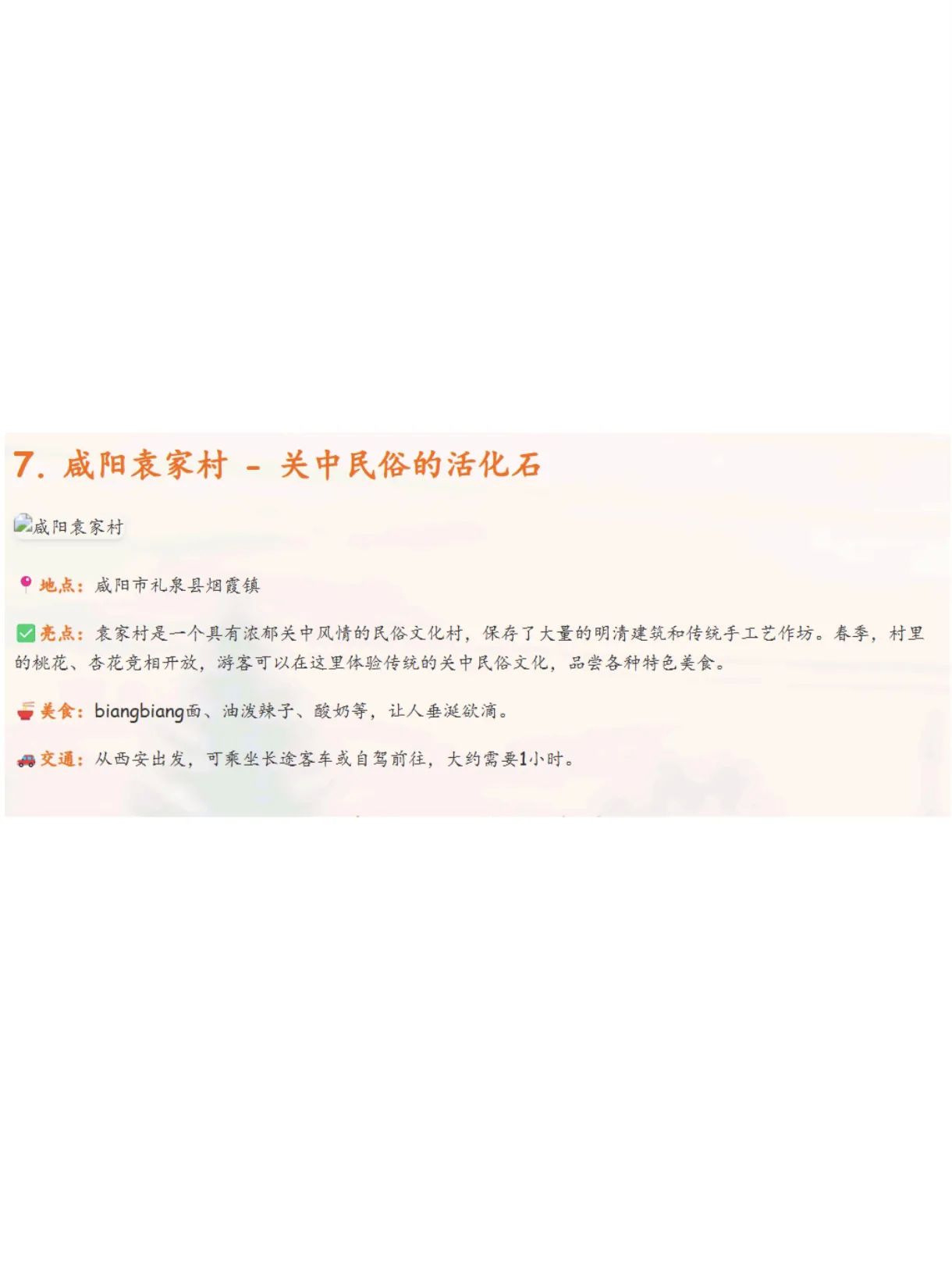 亮点:袁家村是一个具有浓郁关中风情的民俗文化村,保存了大量的明清建筑和传统手工艺作坊。春季,村里的桃花、杏花竞相开放,游客可以在这里体验传统的关中民俗文化!