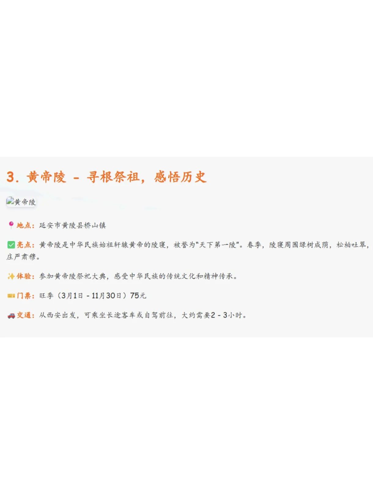亮点:黄帝陵是中华民族始祖轩辕黄帝的陵寝,被誉为“天下第一陵”。春季,陵寝周围绿树成荫,松柏吐翠,庄严肃穆