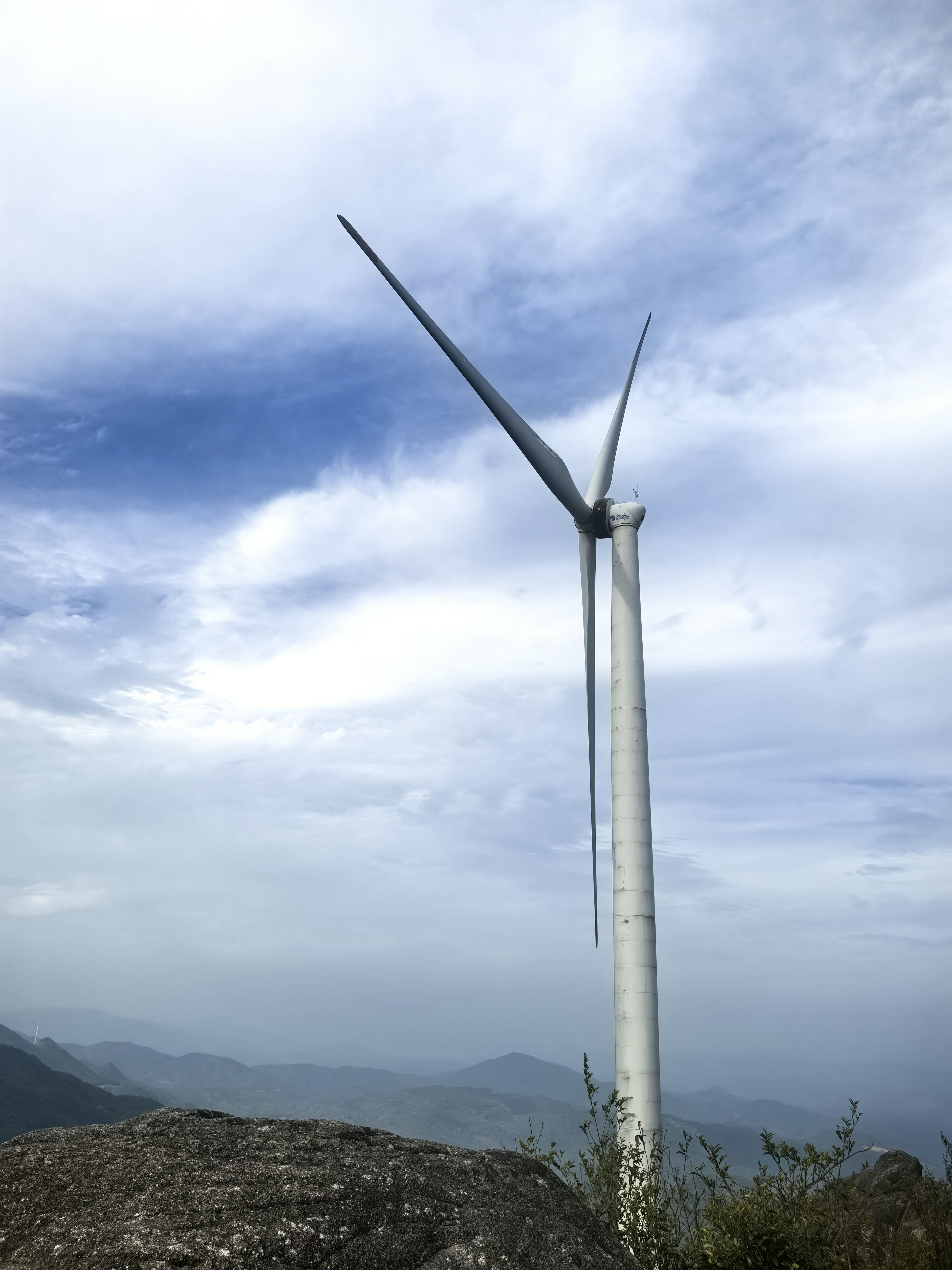 山顶上竖立有很多巨型的风能发电机,远处看这些叶片没有什么大不了,只有抵近观察,才发现每一片叶片长度近50米,真是大的吓人。