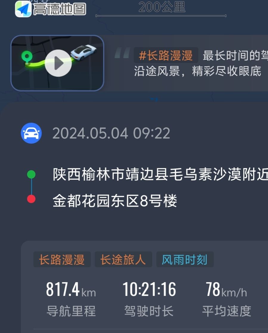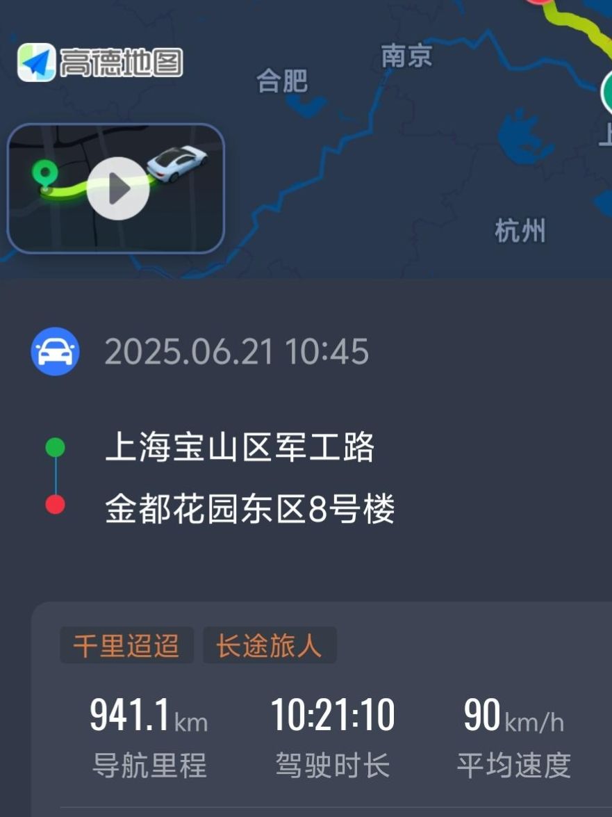 我是20年以上的驾龄了,曾经做过专职驾驶员,对于长途驾驶还是比较有信心的。今年6月份去上海提车回来,从早上10点多出发,到家晚上9点多到家,总里程941.1公里。此次行程是我个人驾驶里程最长的一次。