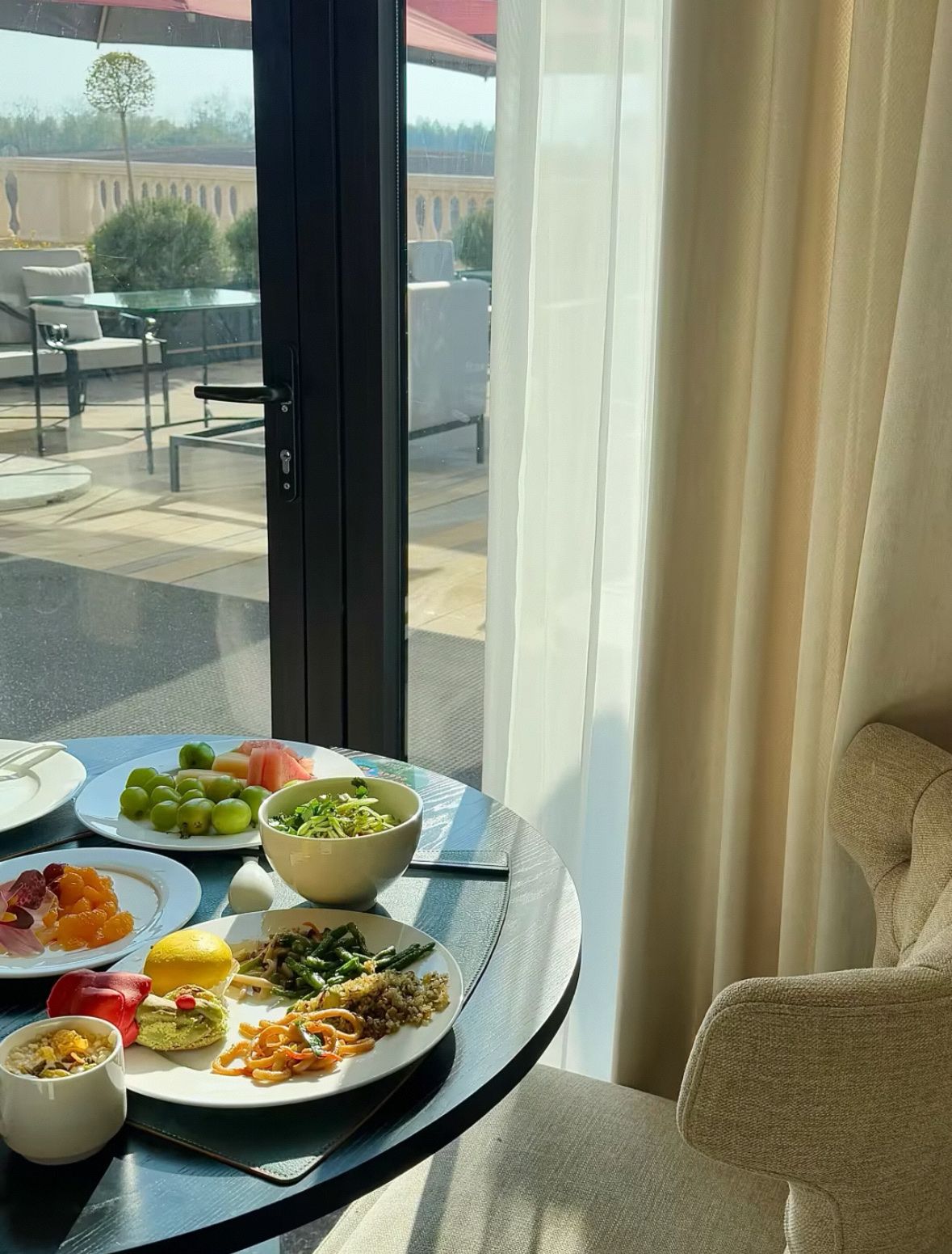 房间是我喜欢的简约风,没有花哨的装饰,原木色的桌子、米白色的床品,连窗帘都是素雅的棉麻材质。床品是真的舒服,躺上去像陷进软乎乎的被子里,白天在花田走了一万多步,沾枕头就睡沉了。窗边有个小茶几,晚上泡上酒店给的茶包,看看窗外的街灯,感觉整个人都松下来了。
