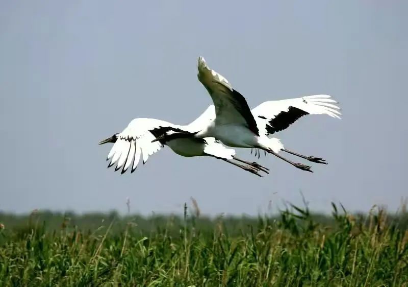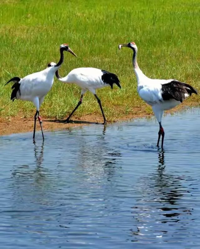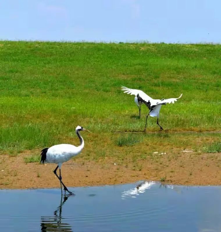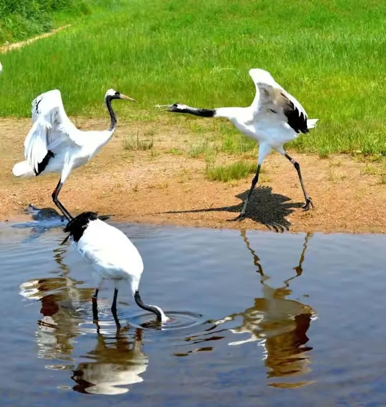 我屏息,怕惊扰了这旷世的彩排:修长的腿探入浅滩,脖颈划出优雅的弧,忽然振翅——白羽掀起雪浪,黑翼描出墨线,红冠则是一枚朱砂印,盖在天地这幅大写意上。最动心魄是鹤舞,双鹤对鸣,素翅陡然舒展,化作丈余白练当空舞动。足尖轻点浅滩绿地,它们时而并立,时而盘旋,腿绷如弓弦,每一次腾跃都似将大地的精气吸入羽翼。当两鹤颈项交缠,朱冠相映,恍若白衣仙人执笔,以缠绵姿态在晨光里,把忠贞与长寿,都编进自己的节拍。此情此景,方知古人以鹤喻君子,实非虚言。