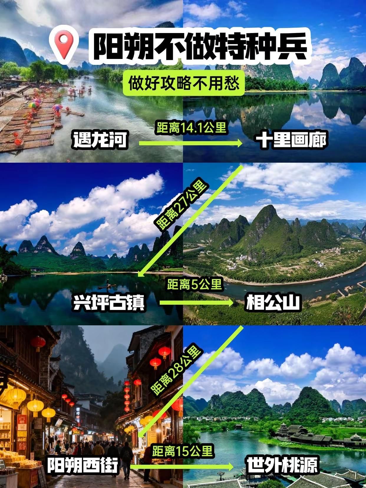2天玩转阳朔南宁,景点美食全方位指南2天游玩阳朔南宁,做好攻略真的不用慌!山水、古镇、夜市、地标全打卡,附超顺路线+必吃清单,新手直接抄作业!路线指南阳朔篇:沉浸式躺平赏山水1. 遇龙河十里画廊(14.1km)遇龙河坐竹筏,小电驴逛十里画廊,超治愈~2. 兴坪古镇相公山(27km5km)早起去相公山,登顶就能看到漓江第一湾的日出兴坪古镇别只冲20元人民币背景地3. 相公山阳朔西街世外桃源(28km15km)西街吃桂林米粉,逛会儿文艺小店再出发去世外桃源。~南宁篇:逛吃暴走感受烟火气1. 广西民族博物馆青秀山(2km)上午去民族博物馆,看56个民族的服饰和手工艺品,拍照很出片!下午直奔青秀山,空气超清新~2. 青秀山东盟盛天地三街两巷(8km5km)从青秀山出来去东盟盛天地,逛潮牌店、喝杯咖啡歇脚,傍晚去三街两巷。老骑楼里藏着很多南宁老字号,买袋酸嘢边走边吃,感受百年街区的慢时光~3. 三街两巷埌西夜市民歌湖广西文化艺术中心(4km3km6km)逛吃灵魂必须交给埌西夜市!老友粉、烤生蚝、卷筒粉闭眼点,再买杯槐花粉解腻~吃完去民歌湖坐游船,看岸边灯光倒映在水里,最后去文化艺术中心看场演出,完美收尾!美食指南三个椰子(三街两巷店)谢大姐非遗啤酒鱼(印象店-黑金店)岩洞餐厅发呆·半山空中九号生态苑农庄(十里画廊遇龙河店)稻花开了·茶汤鸡小贴士• 阳朔到南宁建议坐高铁,1.5小时直达,省时又方便~• 阳朔竹筏提前在网上订票,避开旺季排队;南宁夜市晚上7点后更热闹,记得空着肚子去!亲测2天这样玩不赶不累,还能把两地精华都打卡!#阳朔美食#南宁美食#广西旅游攻略#广西周边游#国庆出行