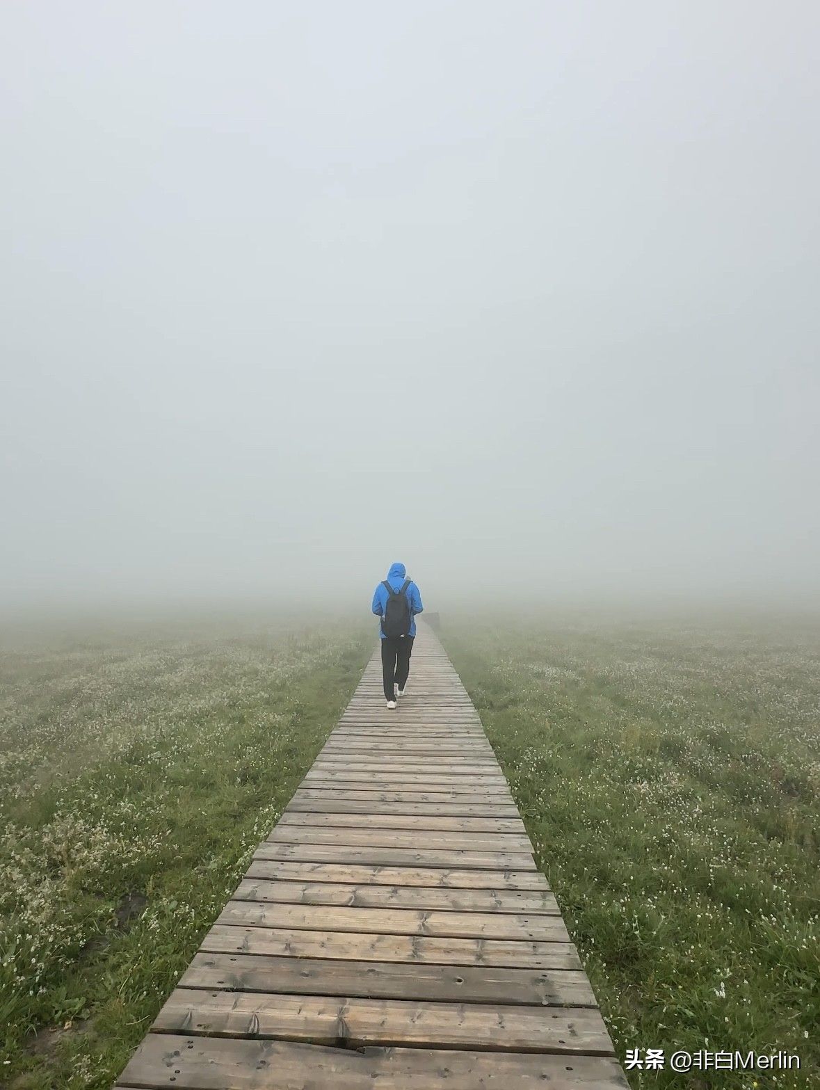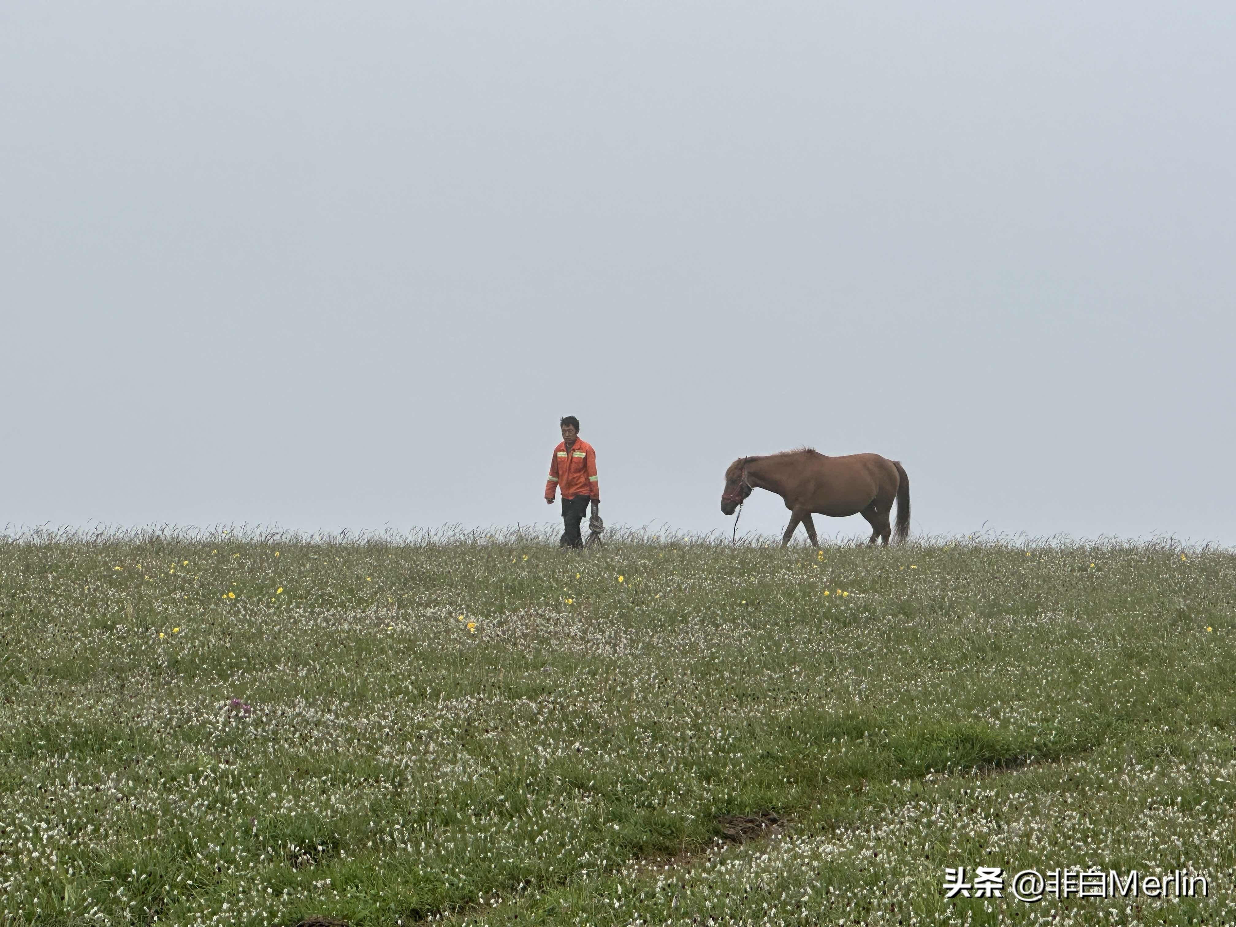 抬头望去,往日开阔的草甸被浓雾揉成了一幅写意画。近处的野花半隐在雾里,远处的山脊线完全没了踪影,原本清晰的“骆驼石峰”只剩个模糊的轮廓,像水墨画里未干的淡墨,风一吹,那轮廓便轻轻晃了晃,似要融进更深的雾色里。