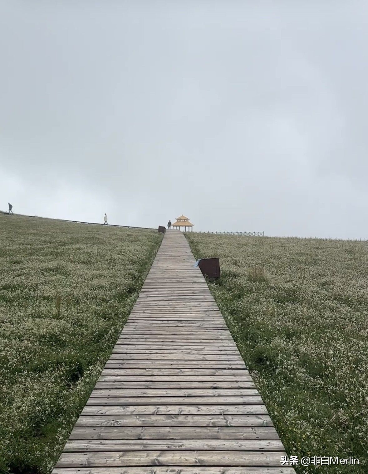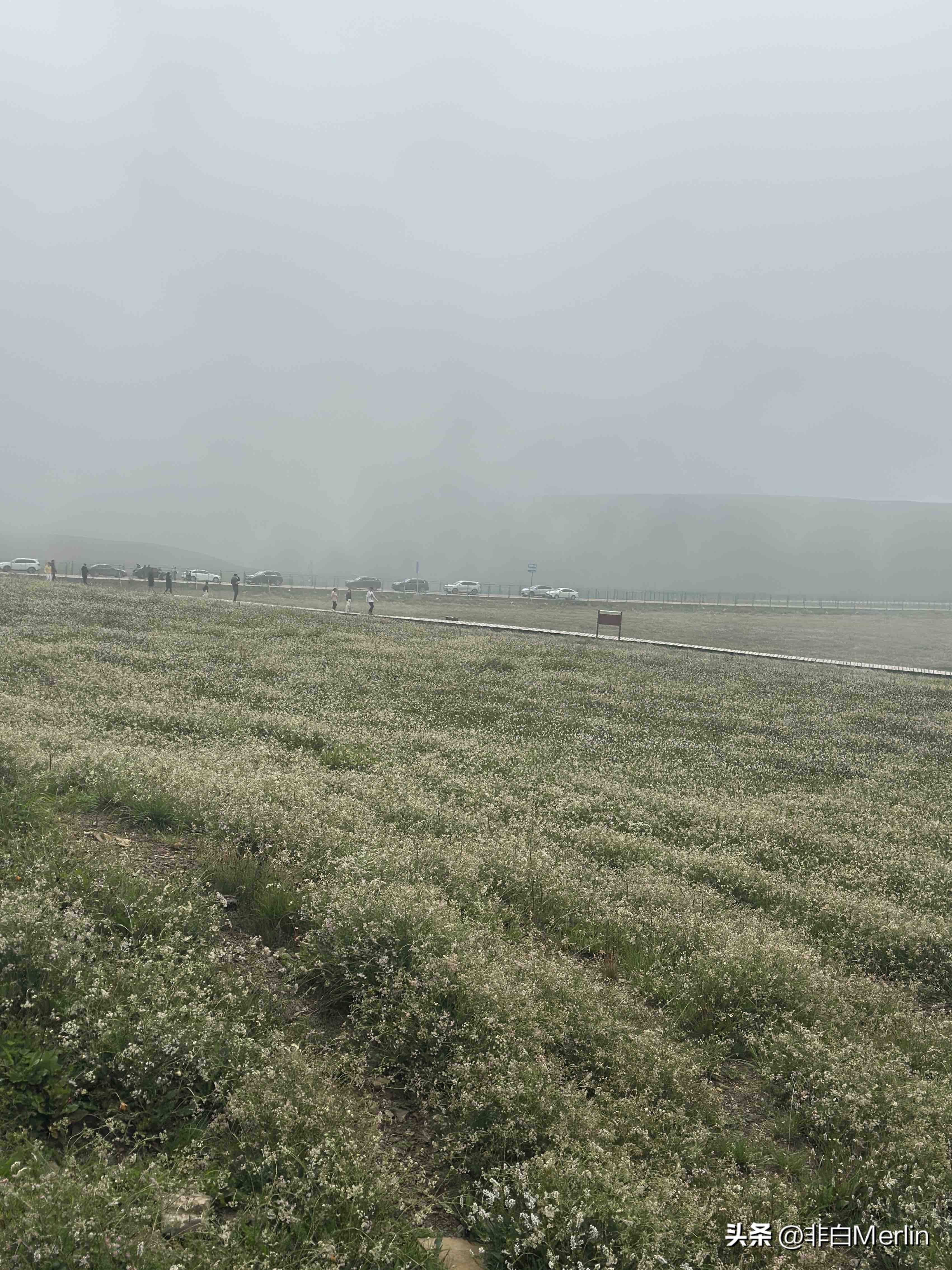 最妙的是雾散的瞬间。一阵风过,浓得化不开的雾像被掀开的纱帘,远处的芦芽山忽然露出半截峰顶,青灰色的岩石衬着背后淡淡的天光,像水墨画里突然点染的重彩。草甸上的雾气顺着地势流淌,低处的谷地成了白茫茫的云海,高处的野花、石块成了海中的岛屿,人如踏着“云海”走过,雾绰绰后面行人的声音,竟像是从云端传来。
