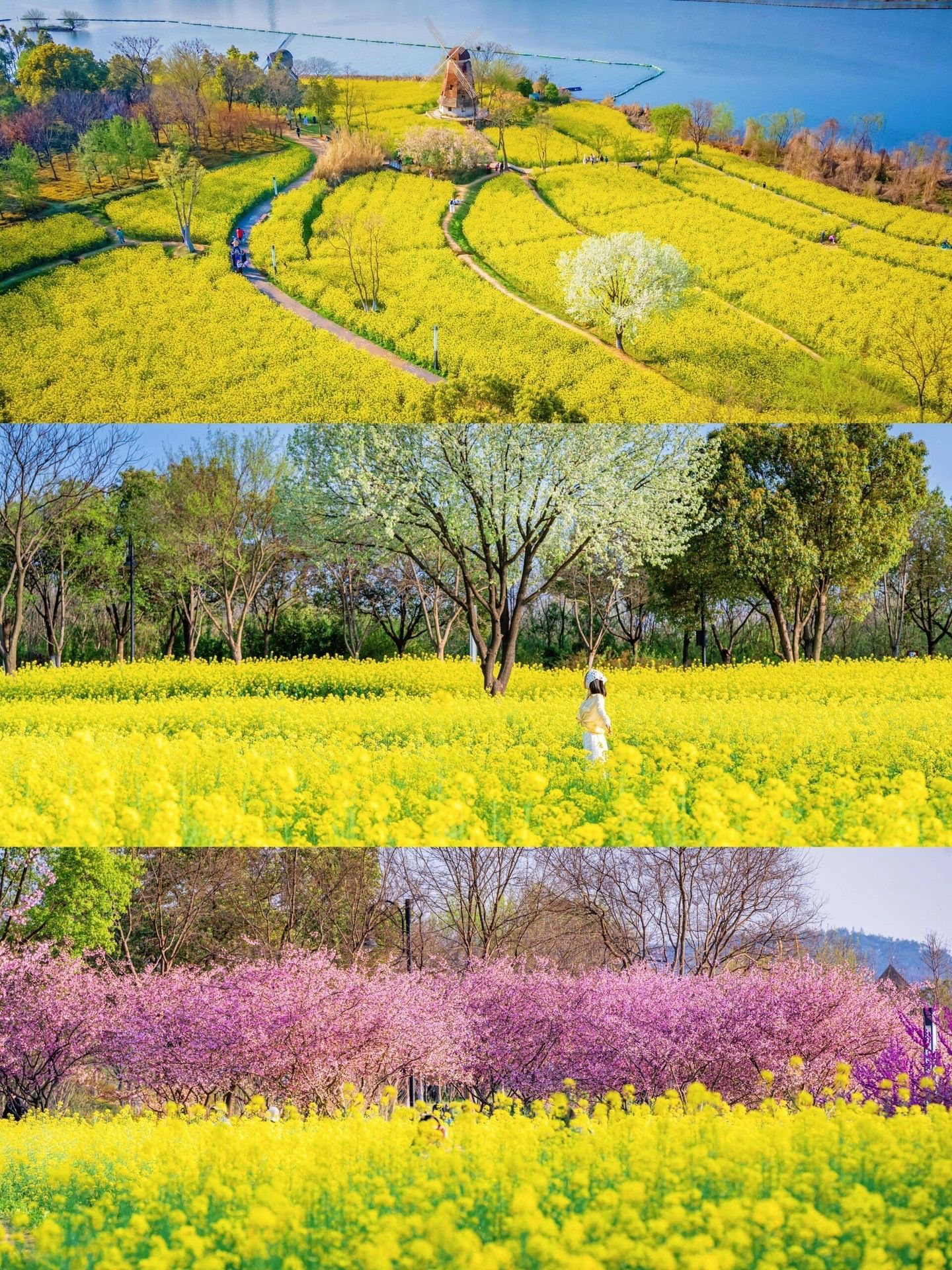 油菜花与古色古香的建筑相呼应,仿佛穿越回古代。还有丰富的游乐项目,团建超合适。