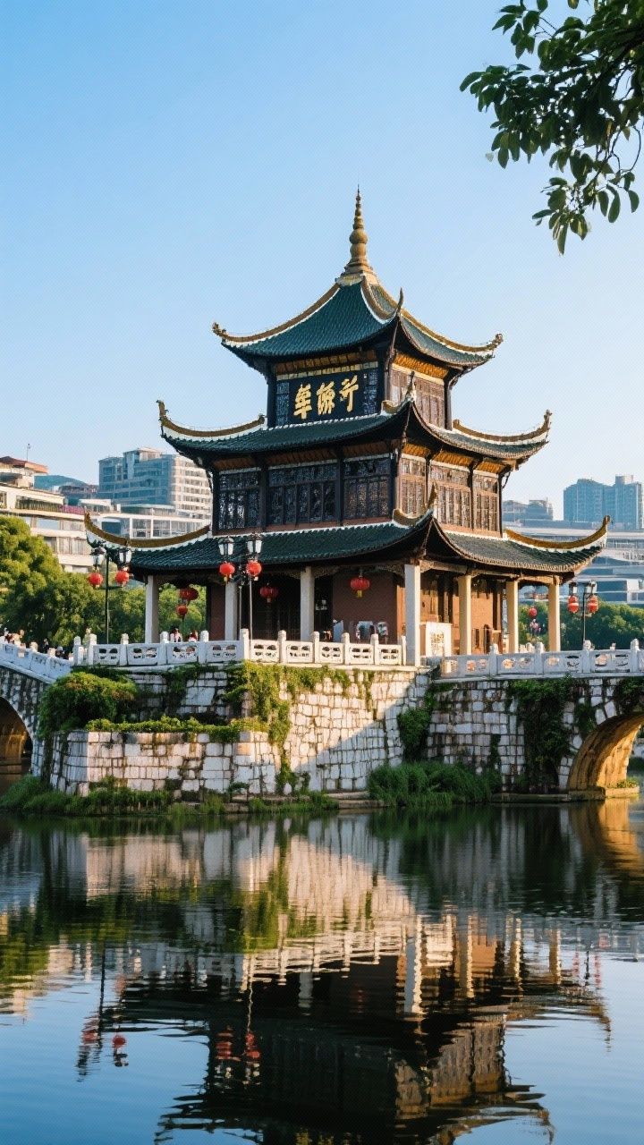 傍晚打卡【甲秀楼】夜景,拍“浮玉桥+南明河”倒影