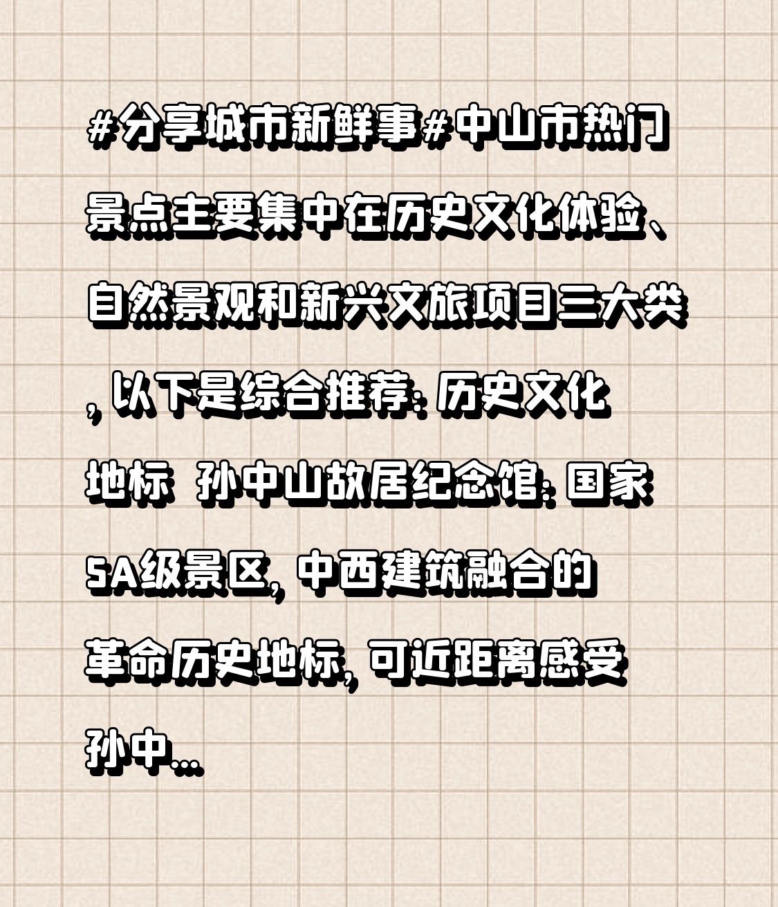 #分享城市新鲜事#中山市热门景点主要集中在历史文化体验、自然景观和新兴文旅项目三大类,以下是综合推荐:历史文化地标