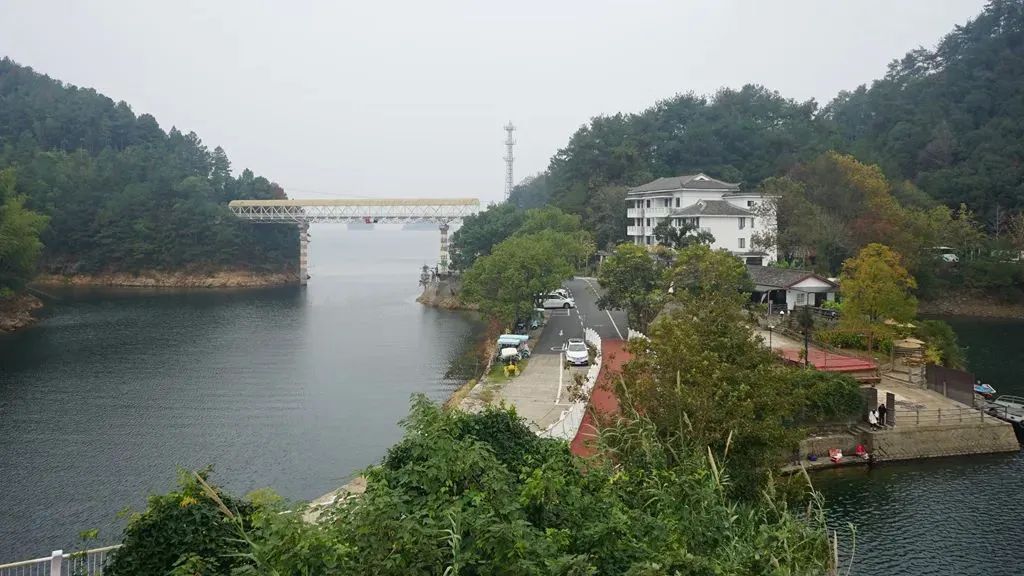 继续前行,便来到雄伟壮观的上江埠大桥。它宛如一条巨龙横跨在千岛湖之上,桥身倒映在水中,与湖光山色相映成趣。站在桥上极目远眺,广阔的湖面尽收眼底,远处的岛屿星罗棋布,如同一颗颗绿宝石镶嵌在这片蓝色的绸缎之上,构成了一幅如梦如幻的山水画卷。