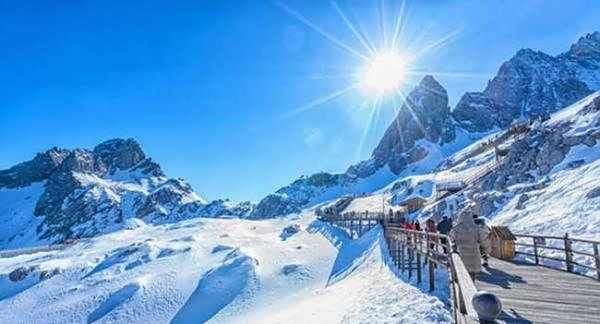 特色:玉龙雪山不仅气势磅礴,而且秀丽挺拔,造型玲珑,皎洁如晶莹的玉石。从山脚到山顶,有亚热带、温带、寒带等多级景观。游客可以沿着山间栈道近距离观赏冰川和主峰的雄姿。