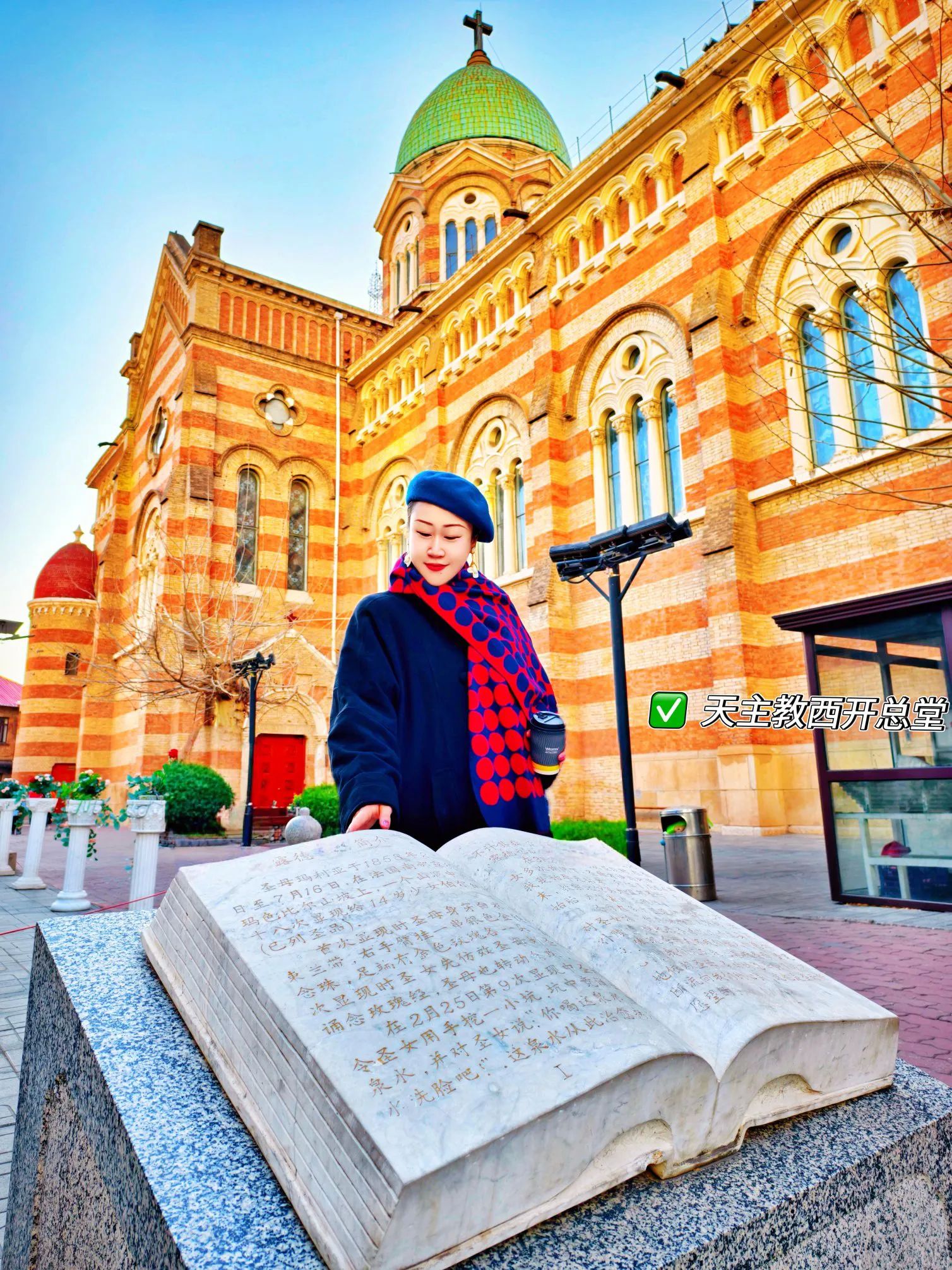 湛蓝穹顶的西开教堂是天津天主教总堂,这座1916年建成的罗马式教堂,三座绿色铜顶在春日晴空下熠熠生辉。