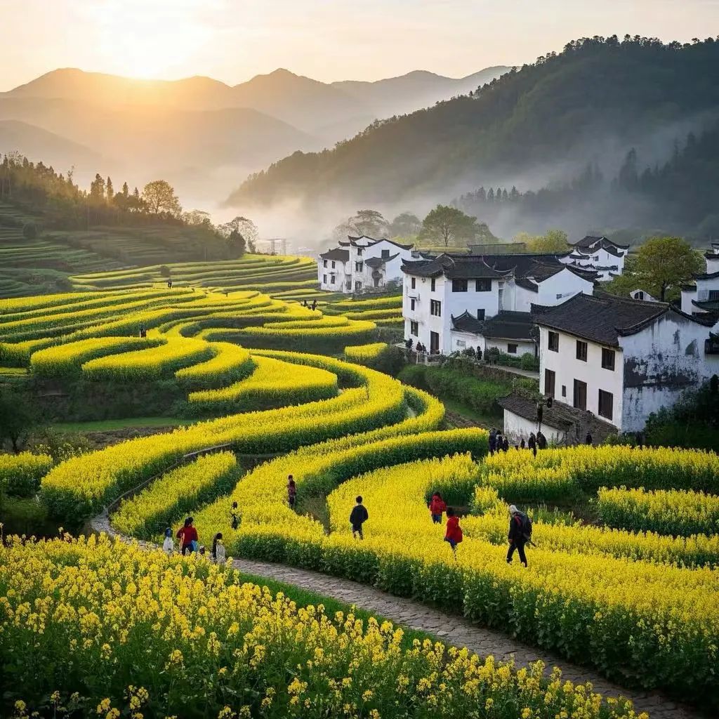 有“中国最美乡村”美誉的婺源,在三月中旬摇身一变,成为了一片金色的海洋。层层叠叠的油菜花梯田如金色波浪般翻涌,与白墙黛瓦的徽派建筑相互交织,构成了一幅流动的水墨画。行走其间,仿佛误入了古人笔下的诗意田园。