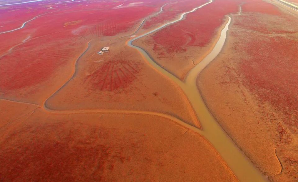 也许平时,在黄河口的滩涂上看到的景色是青绿色的水流搭配鹅黄的植被、蜿蜒的沟壑,但是从9月份开始,滩涂慢慢变红,红毯蔓延开来,秋日的滩涂,身着一身红袍。