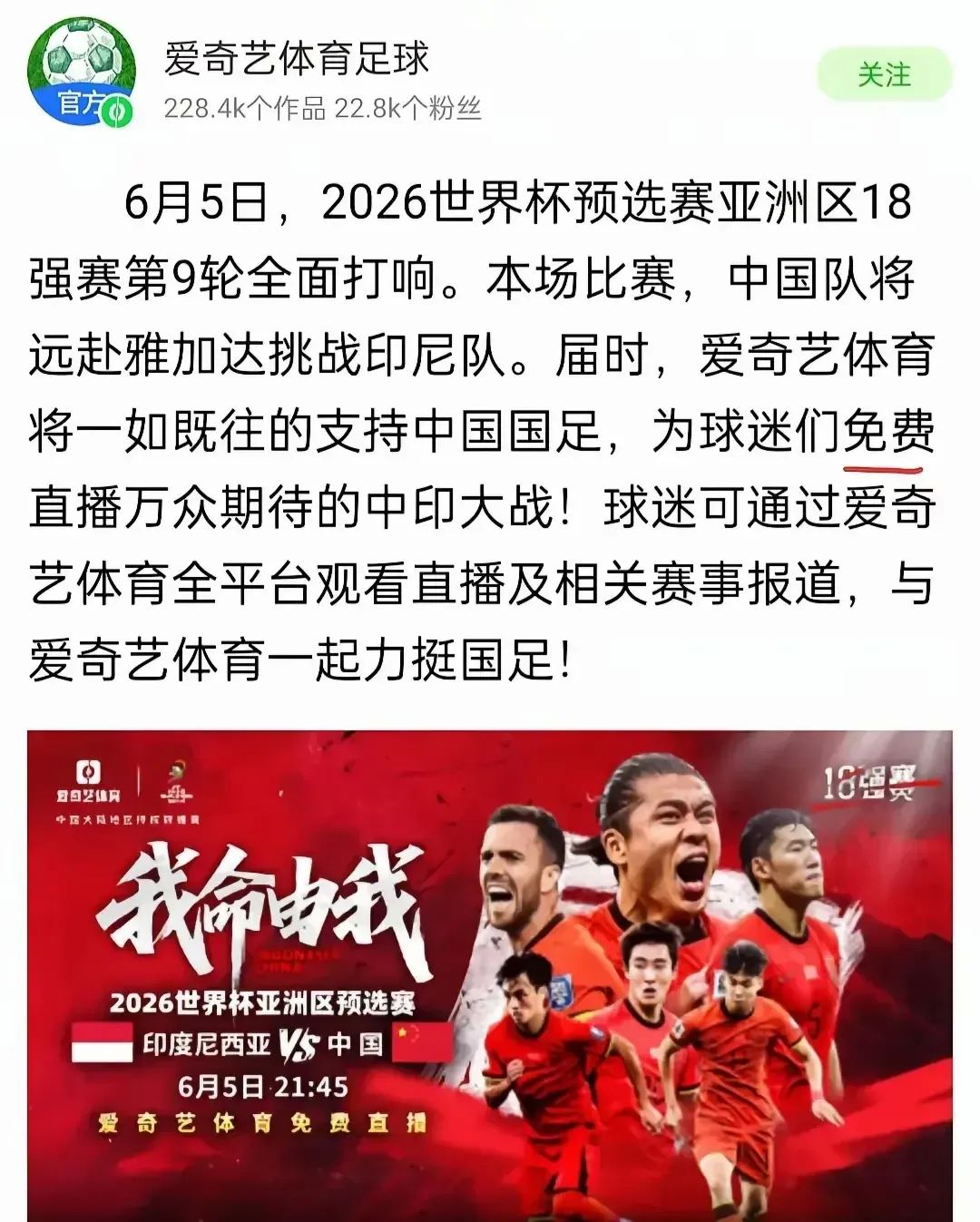 昨天晚上,两个大平台同时官宣,爱奇艺明确表示会免费直播国足对阵印尼的比赛。这可是好事啊!平时想看比赛得花不少钱,现在不用花一分钱就能在手机上看了。要知道,这场比赛可是2026年世界杯预选赛的重要一战,关系到中国队能不能提前晋级,影响挺大的。