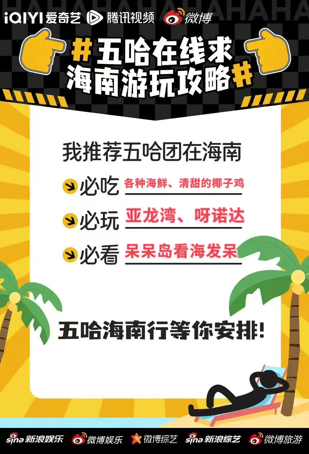 每次官微释放网友提名地点的路透打卡图时,就感觉离揭开海南的神秘面纱又近了一步。等到节目正片播出,期待“五哈团”亲测海南旅游攻略,回应那些网友的提名内容的那一刻。