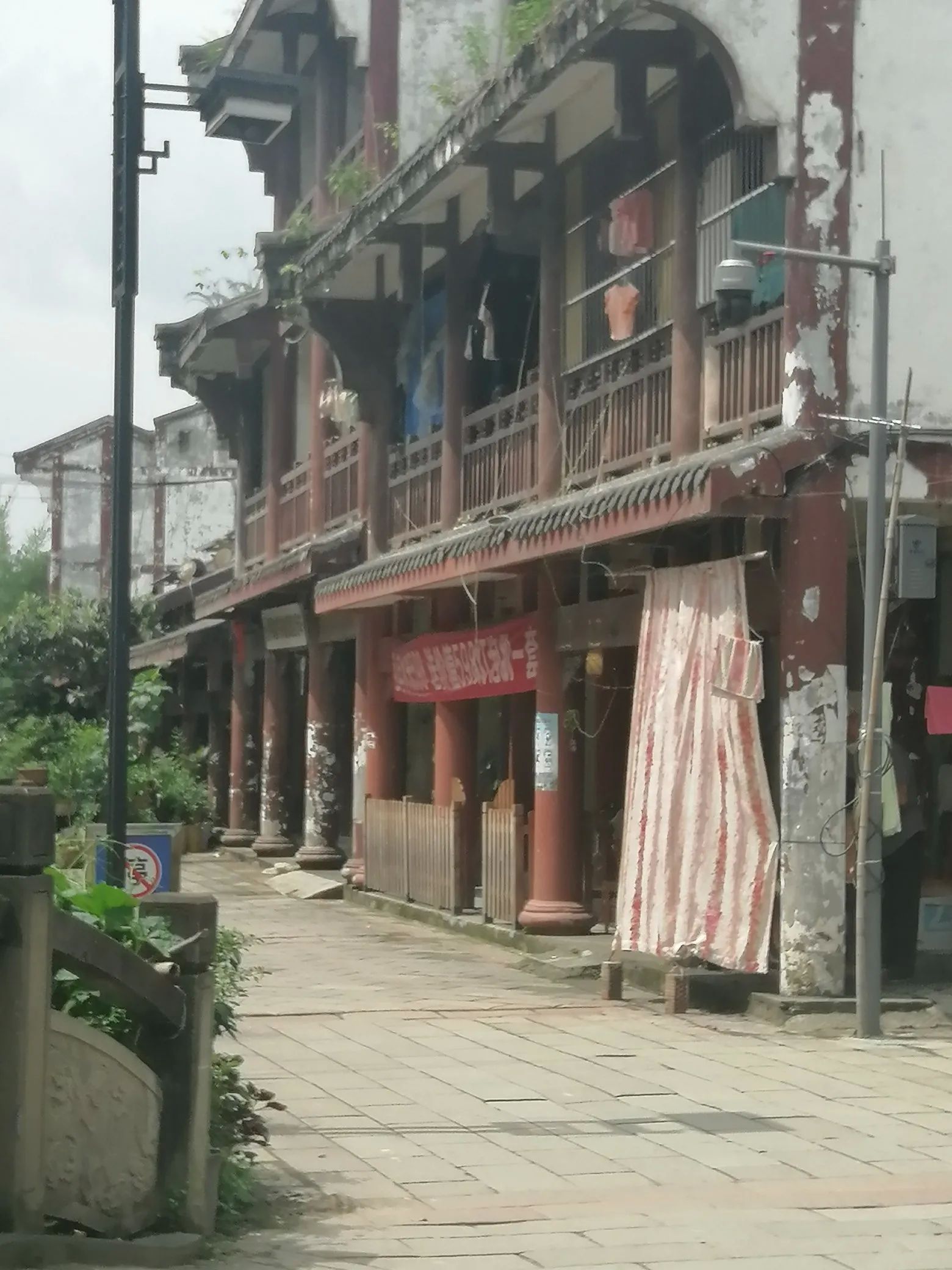 镇虽不大,但横竖有好几条街,大都是解放后修的房子。但我准备到文化广场的途中,经过一座古老的牌坊,上有《城武街》三个字。我经过牌坊往里走,一条小溪哗哗的流尚,两边砌有石头栏杆,小桥溪水的两边,有古老的清代建茿。全是木板装的墙壁,柱头,门槛,均留着古老的痕迹。